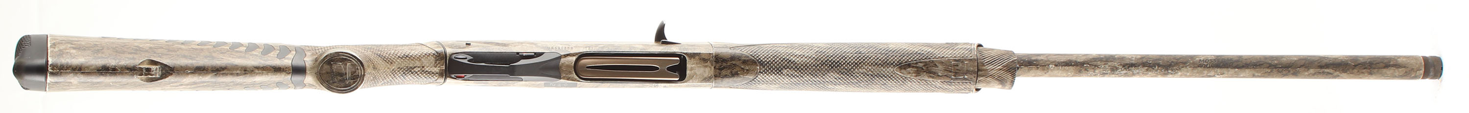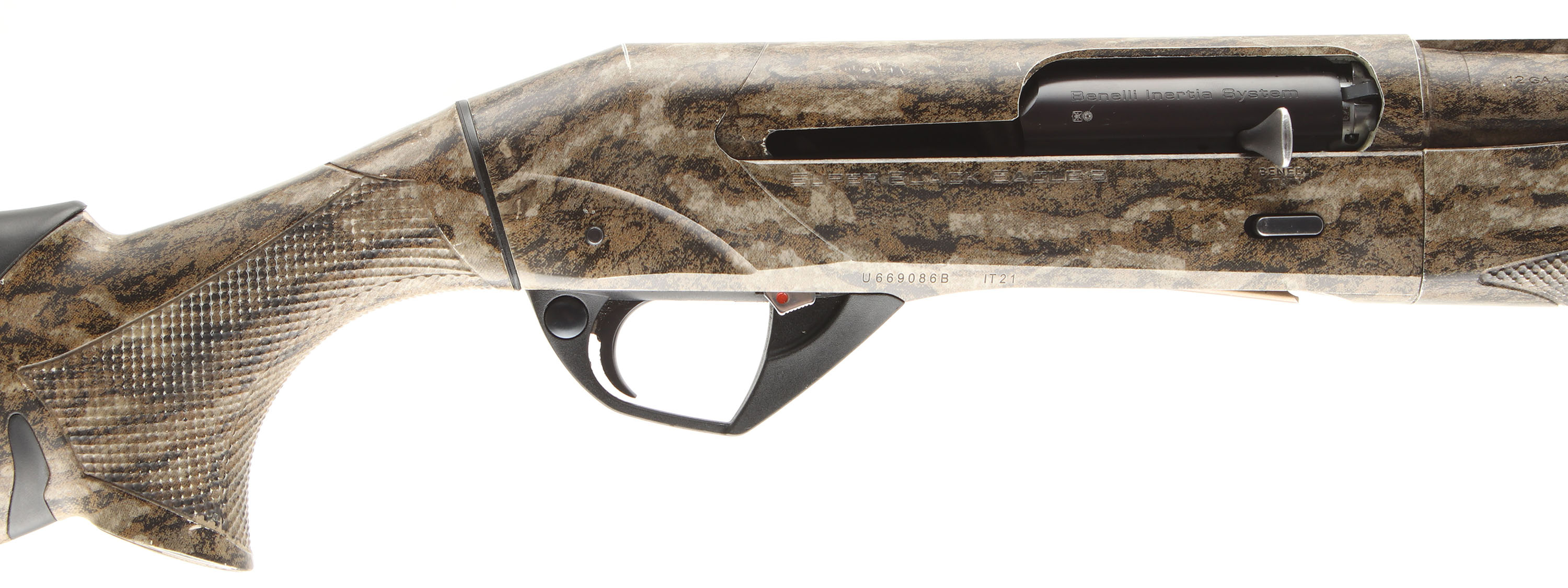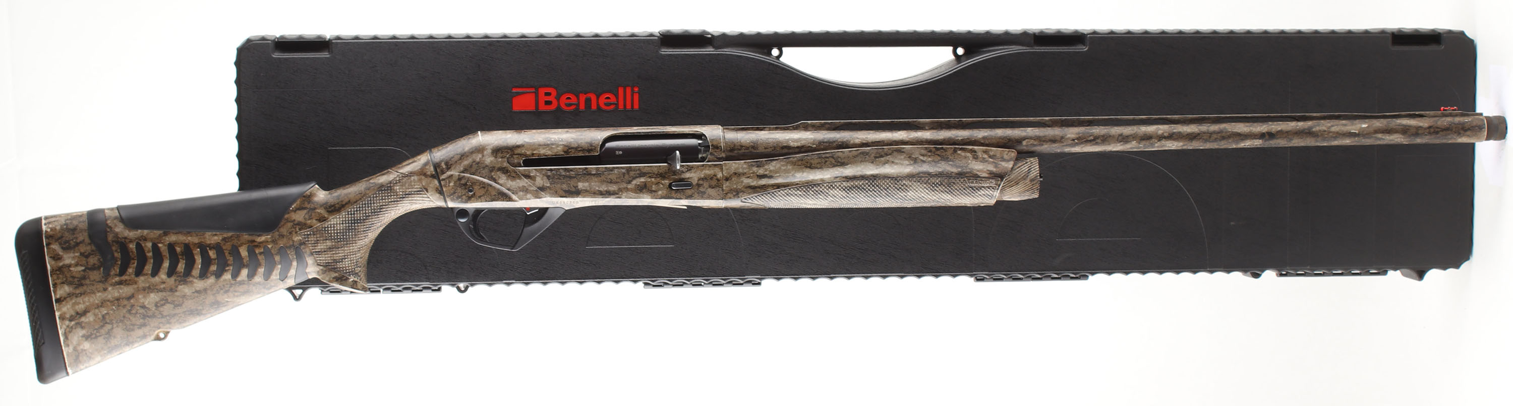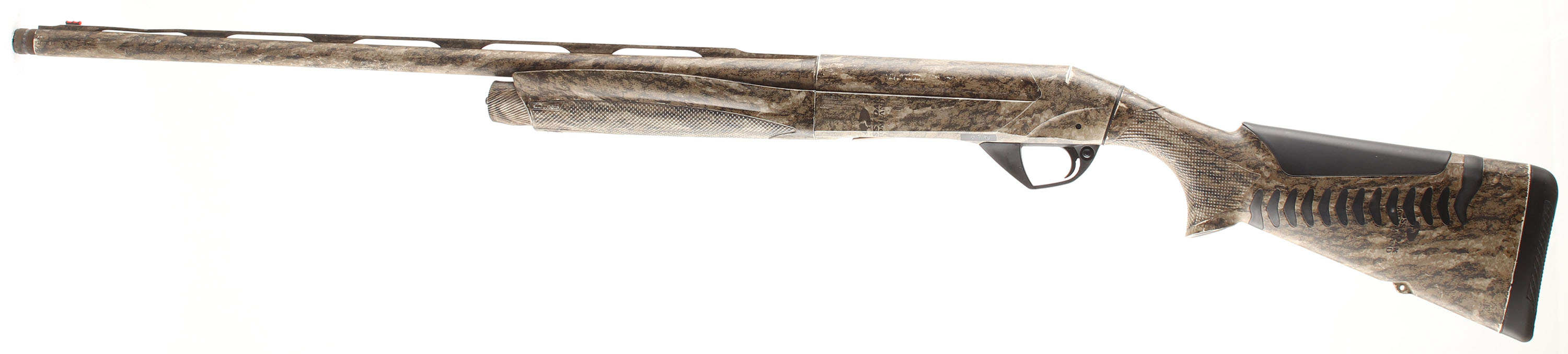 CASED, Benelli, SBE III, CAL: 12GA, MFG: Modern, SN: U669086B, Semi Auto Shotgun, Screw-in Chokes, 26'' ventilated rib barrel. Standard factory markings. The factory checkered synthetic stock is excellent. The MossyOak Borderlands camo finish is very good, with some small areas worn to white. The camo finish on the barrel & receiver rates 85% overall. Bore is excellent. The ventilated rib holds a red fiber optic front sight. Comfortech stock & recoil pad. Sling provisions. The foremost vent opening is bent down towards the barrel. Comes in factory hard case, with choke tubes, tool, & original packaging. FFL Req. - Value: 1000 to 1400