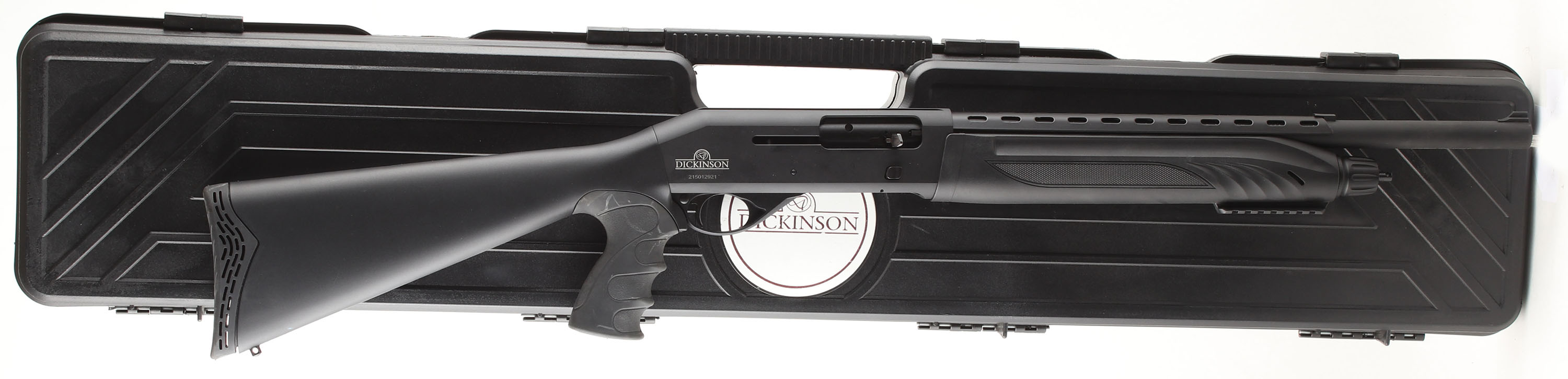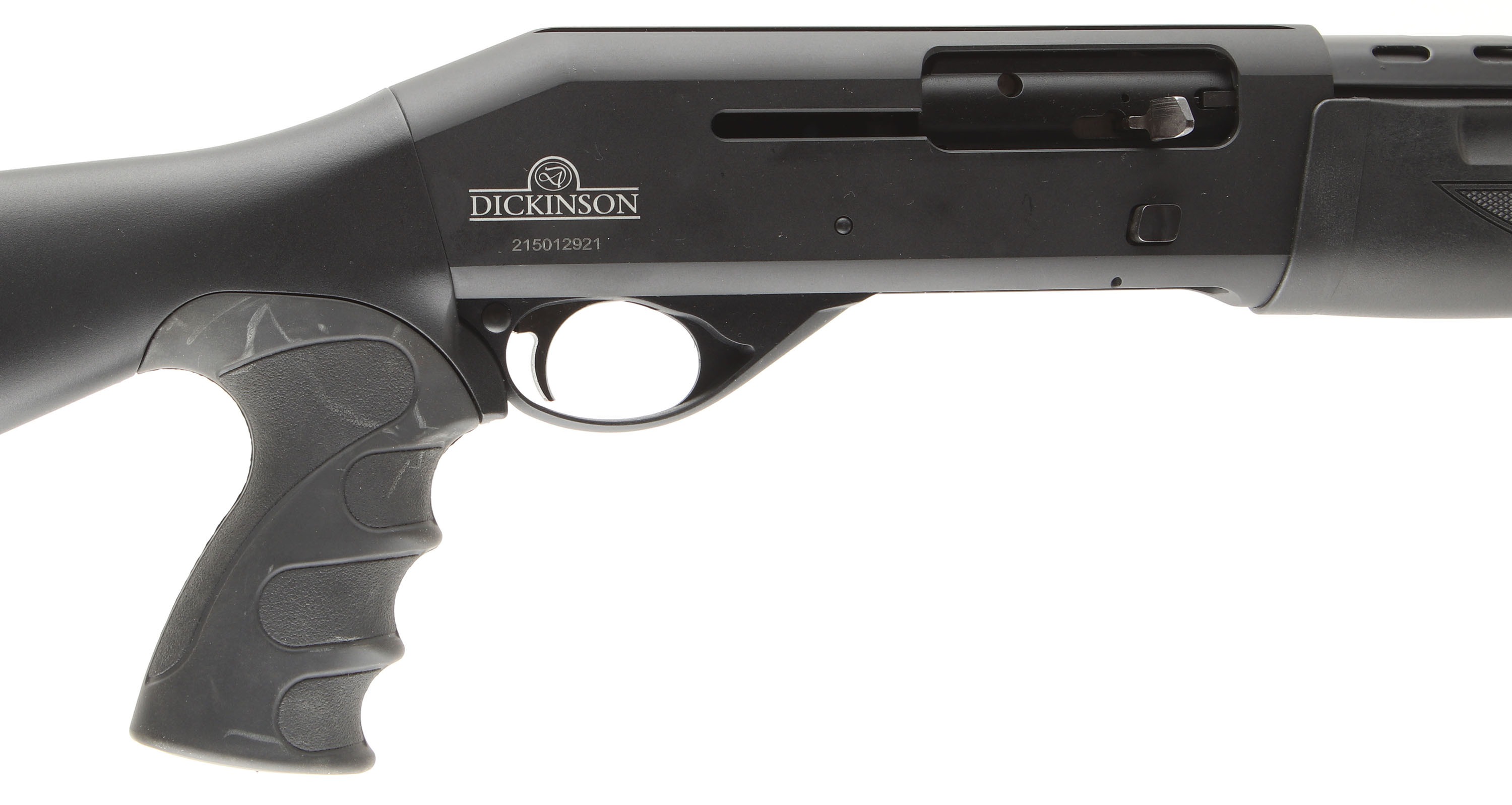 CASED Dickinson (KOMANDO Turkey), CAL: 12 GA, MFG: Modern, SN: 215012921, Semi-Auto Shotgun, Choke: Improved Cylinder, 3'' Chamber, 18 1/2''. The polymer furniture with rubber grip is excellent with minimal wear. The parkerized finish on the gun is excellent with minimal wear. Bore is excellent. The barrel holds a front sight. The buttstock carries a ventilated rubber recoil pad. LOP: 14 1/8''. A sling stud is present on the rear of the stock, the endcap of the magazine tube has a sling stud, the forend has a segment of picatinny rail, & there is a heatshield on the barrel. Comes in a correct factory plastic hard case with a lock & an owners manual. FFL Req. - Value: 80 to 160