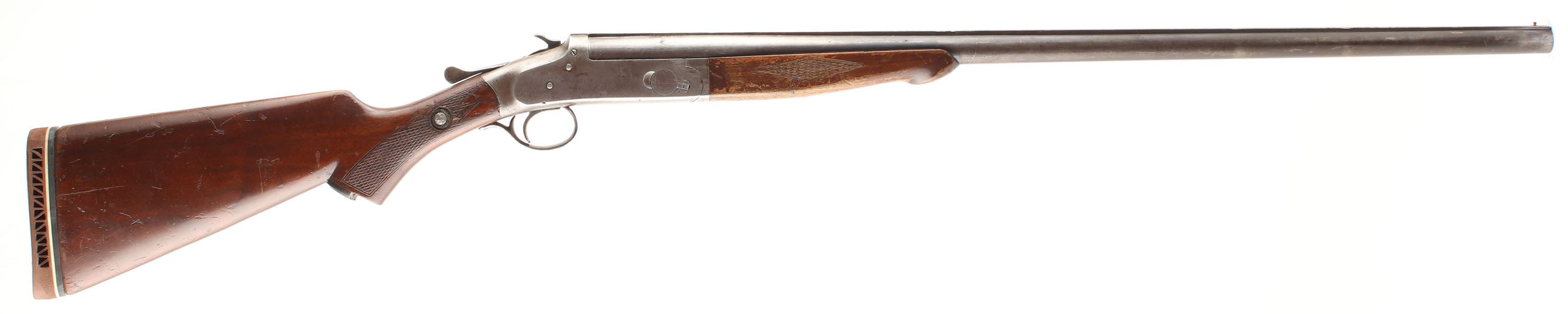 H.S.B & Co. Rev-O-Noc, CAL: 12GA, MFG: N/A, SN: 83513, Break Action Single Shot Shotgun, Choke: Full, 30'' barrel. The original checkered flat pistol grip stock is good & solid. There is a bolt through the middle of the wrist, along with scratches, scrapes, dings & areas of thinning finish. The grip cap is broken. The blued finish on the barrel has worn to a mix of metal gray, brown patina & remaining finish. The receiver has fully worn to metal gray, with areas toned to a brown patina with intermittent spotting. Bore is good & bright, with intermittent pitting, scarring & roughness. The solid matted rib holds a single front bead & the stock has an oversized Pachmayr ventilated brown rubber recoil pad. FFL or C&R Req. - Value: 100 to 200