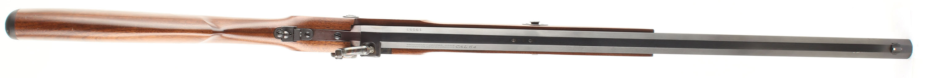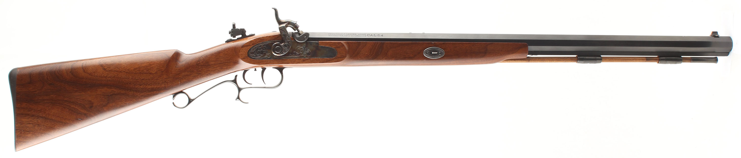 CONDITION: The straight wrist walnut half-stock is excellent with only a few minor nicks & scuffs from handling. Black metal trigger guard that extends as a semi-pistol grip. The blued metal finish rates 98% overall with a few light scuffs & spots of wear near the muzzle. The lock plate & hammer retain 99% of its beautiful case-hardened finish & have ornate engravings. Right side of the barrel has MFG & caliber Information, right side holds the S/N. The bore is excellent. Bright & shiny with little visible wear. The barrel holds a white beaded blade front sight in a dovetail, barrel tang holds a windage & elevation adjustable zero, aperture rear sight. The stock carries a metal buttplate. The rifle has no sling provision. Rifle comes with a double ended, wooden ramrod. Double set triggers, front trigger can fire set & un-set. Mechanical function is solid. A like new beautiful muzzleloader that would make a excellent shooter or hunting rifle. Muzzleloader, No FFL Req - Value: 250 to 500