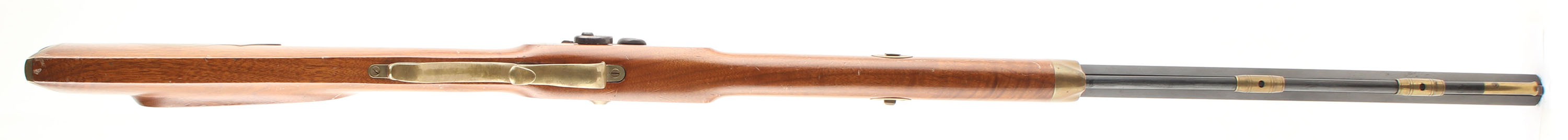 CONDITION: The straight wrist walnut half-stock is very good with some nicks, dings, & scratches from use. Brass furnished with a semi-pistol grip trigger guard & a patch box in the right cheek, the brass has patina & needs a good polish. The blued metal finish rates 92% overall with some spots of thing/wear & speckles of rust concentrated mostly by the end of the barrel. The lock plate has worn gray & is starting to tone brown, still some spots of the case-hardened finish visible in protected areas. There is some roughness, rust & corrosion by the nipple & on the hammer. The lock plate & hammer have ornate engravings. Right side of the barrel has MFG & caliber Information, right side holds the S/N & black powder info. The bore is good to fair. Bright & shiny with some roughness through the bore, one spot of concentrated roughness/light pitting from not being cleaned after firing. The barrel holds a beaded blade front sight in a dovetail, & a windage & elevation adjustable for zero, wide U-notch rear sight. The stock carries a brass crescent moon buttplate. The rifle has no sling provision. Rifle comes with a double brass ended, black composite ramrod. Double set triggers, front trigger can fire set & un-set. Mechanical function is solid. Muzzleloader, No FFL Req - Value: 150 to 300