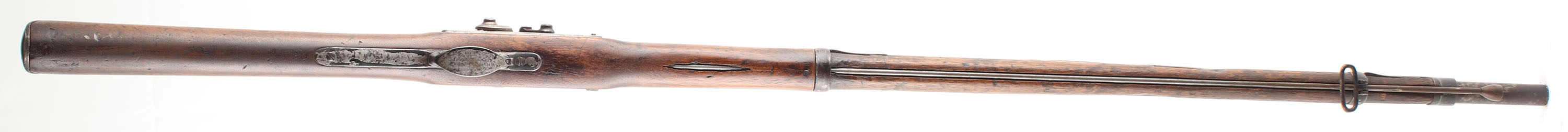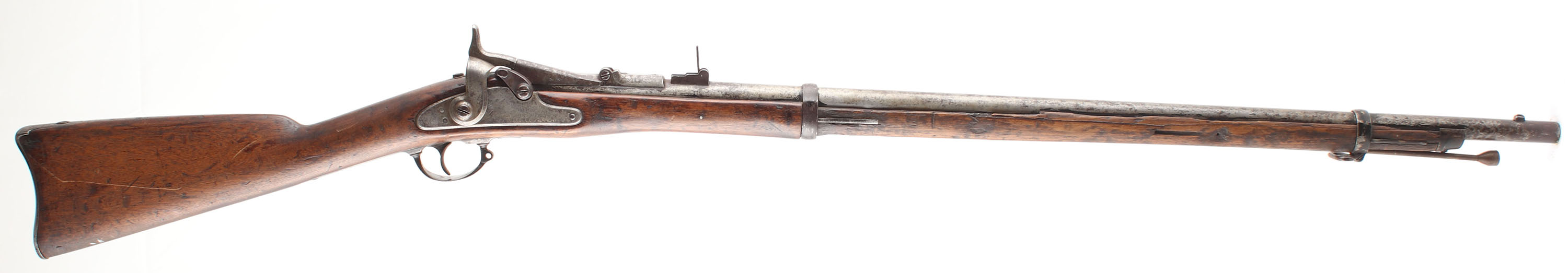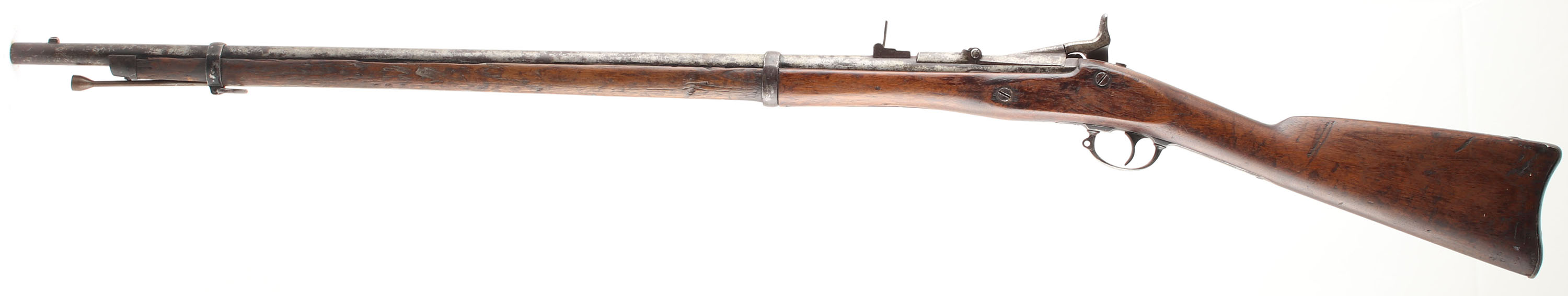 CONDITION: The straight wrist walnut stock is good with various smoothed over nicks, dings, gouges, & scratches from use. There is a hole worn into the bottom of the forend, just in front of the lock plate that is exposing the ramrod channel & ramrod. This was likely caused by saddle wear from carrying across the saddle when riding, common to see on rifles of this era that saw hard use. The right side of the forend has some cracks & wood split repairs. Left flat of the stock has a faded inspector cartouche. The metal has worn gun metal gray with light roughness across the metal & remains of a added black paint in protected areas on all parts of the rifle. The breech block is marked ''1866'', over a eagles head. The lock plate is marked ''1863'', a partial faded American great eagle next to ''US'', over ''BRIDESBURG''. Two-click action. The bore is good to fair. It has thinned rifling with roughness/light pitting. The barrel holds a barleycorn front sight with the original musket L-leaf notch/aperture rear sight. The stock carries a metal buttplate that is a mix of black paint finish, gun metal gray & brown patina. Rifle has the factory front sling loop with the rear loop missing. Rifle has what appears to be a home made ramrod to display with the rifle (end cap threaded). Mechanical function appears solid but with a little ''grittiness'' when the hammer is cycled. Antique, No FFL Req - Value: 600 to 1200
