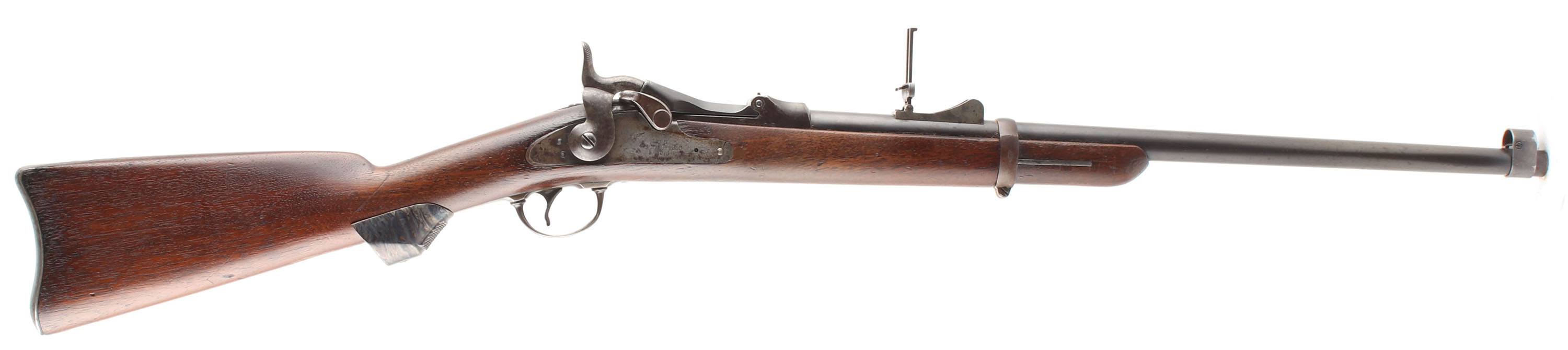 CONDITION: The straight wrist walnut stock is very good with small nicks, dings, & scratches from use. Stock is a cut down rifle stock with a 4'' wood fill in the cleaning rod channel in the forend of the stock (The buttstock cleaning rod was also introduced by the M1879, does not have it). Small wood fill repair at the forward end of the lock plate cutout. No visible inspector cartouche on the left flat of stock. The bottom of the wrist is stamped with the ''P'' in circle firing proof, toe & heel of the stock are stamped ''28''. The metal carries a arsenal re-finish with thinned markings & spots of roughness under the finish. The blued finish on the barrel rates 80% with some scratches & spots of thinning starting to tone brown. The receiver has toned to a dark patina with light roughness. has toned to a mix of gun metal gray & dark gray patina with light roughness across the metal. Breech block was re-blued (instead of case-hardened) at some point (unknown if its from a arsenal or after the fact) with roughness under the finish, the finish rates 85% with some spots of wear showing gray & is starting to tone brown. The breech block is marked ''US'', over ''MODEL'', over ''1873''. The rear of the receiver has the S/N. right side of the receiver marked ''LCB'' (marking slight obscured by stock). left side of the chamber has the very faint remains of the ''V'', over ''P'', over a eagle's head marking, ''P'' proof under that is thinned but fully present. The lock plate is marked with a American great eagle next to ''US'', over ''SPRINGFIELD'', over ''1873''. Markings are thinned with the eagle barely present. Barrel bands is marked ''U''. Three-click action. The bore is good. It's bright & shiny with thinned rifling & spots of roughness. The barrel holds a barleycorn front sight with the M1879 notched ramp base/flip up ladder ''buckhorn'' rear sight. Ladder stamped ''C'' for carbine & marked out to 1500 yards. The stock carries a blued steel non-buttplate (should be by the M1879 with a cleaning rod inside). Plate has toned to a mix of gun metal gray & brown patina. Rifle has a sling bar & ring. Mechanical function appears solid. A nice Springfield trapdoor presenting as a M1879 trapdoor carbine Antique, No FFL Req - Value: 400 to 800