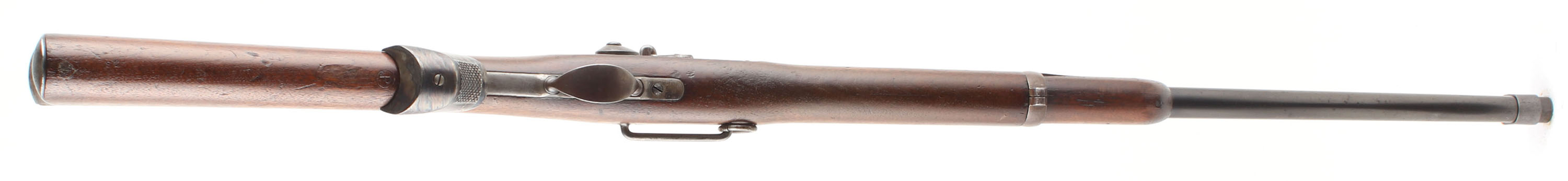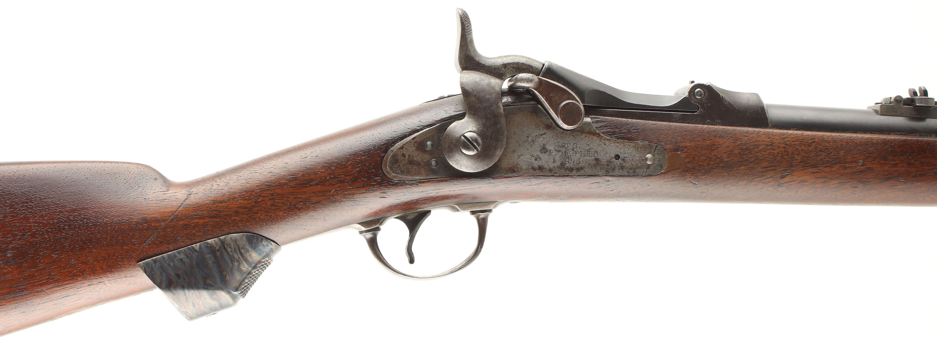 HISTORY: The model 1879 introduced the ''buckhorn'' rear sight to the Springfield as well as some other small internal tweaks to the breech block & action. This sights notch leaf was windage drift adjustable to allowing better zeroing of the rifle, it was not on the fly adjustment as seen on the later Buffington rear sight. The breech blocks would continue to be marked ''1873'' but that marking was removed from the lock plate. This model is also the Transition of the master Armorer at Springfield from Erskine Allin (who came up with the trapdoor conversion) to Samuel W. Porter. This can be seen with both ''ESA'' & ''SWP'' cartouche's seen on the rifles. These were still officially called M1873 by the military but collectors named them M1879's after the year the new sight & modifications were introduced. Older M1873 rifles would also be fitted with the new sight when they went in for refurbishment. This rifle also has a front sight protector & pistol grip added. These are period correct & were made for trapdoors for Military & civilian competition shooting. The pistol grip appears to be a reproduction.
