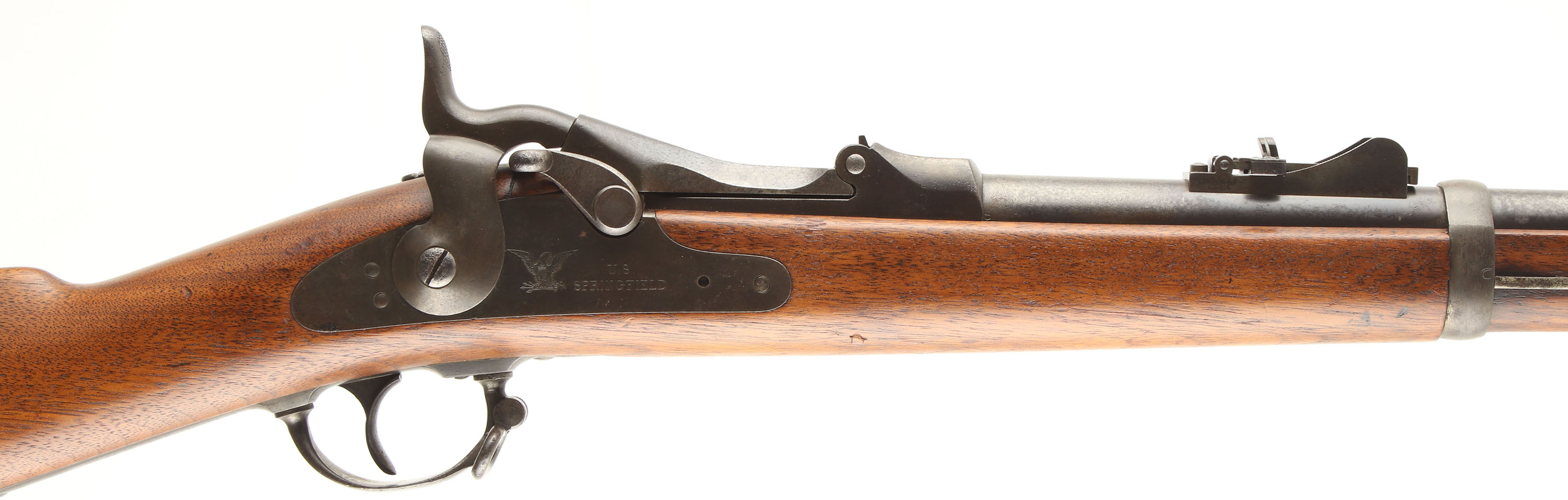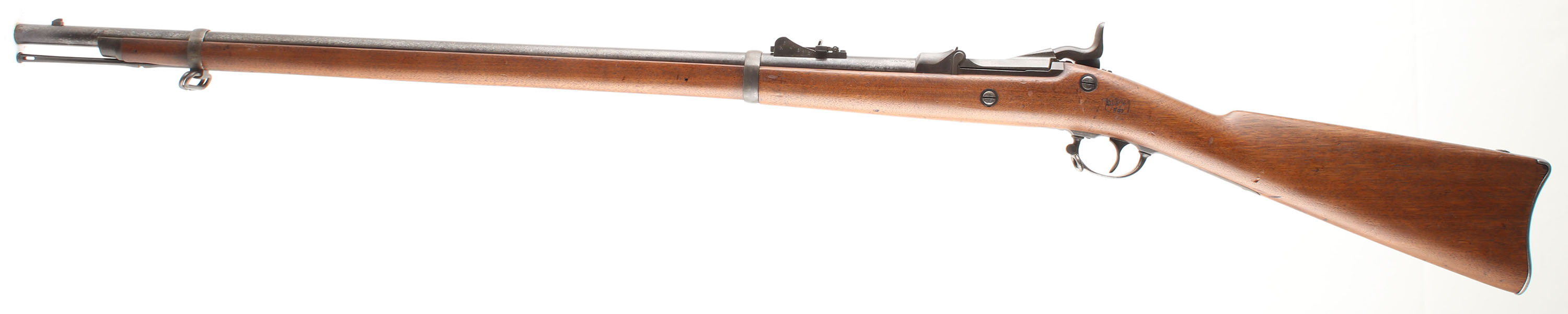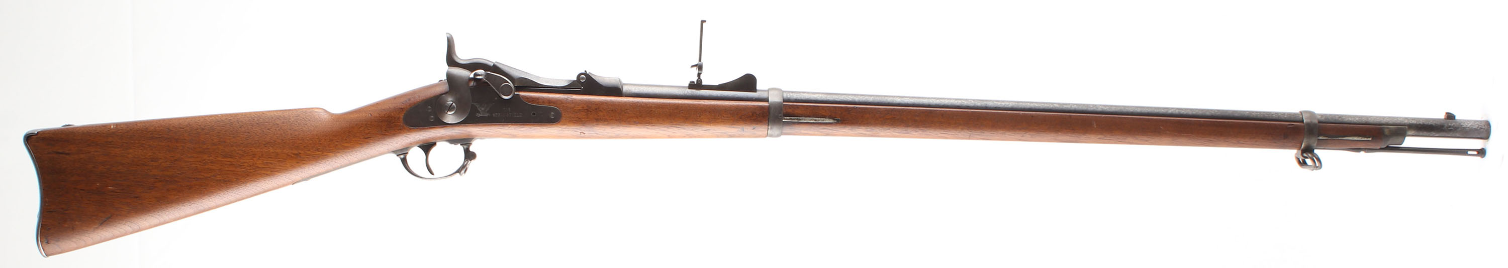 CONDITION: The straight wrist walnut stock is very good as being lightly sanded & re-finished. Stock has small nicks, dings, & scratches from use, older marked are smoothed over from light sanding. The metal is proud to the wood at the toe & lower wrist. The left flat of the stock has the acceptance/inspector's cartouche ''SWP'' over ''1881'' inside a box. The bottom of the wrist is stamped ''?.D.R.'' (first letter faded) & the ''P'' in circle firing proof. The metal has toned to a mix of gun metal gray & dark gray patina with light roughness across the metal. The breech block is marked ''US'', over ''MODEL'', over ''1873''. The rear of the receiver has the S/N. left side of the chamber marked ''V'', over ''P'', over a eagle's head, over ''P'', & the top is marked ''R''. The lock plate is marked with a American great eagle next to ''US'', over ''SPRINGFIELD''. Both barrel bands are marked ''U''. upper extension of buttplate marked ''US'' & ''55''. The bore is good. It's bright & shiny with lightly thinned rifling & spots of roughness/ light pitting. The barrel holds a barleycorn front sight with the M1879 notched ramp base/flip up ladder ''buckhorn'' rear sight. The stock carries a blued steel buttplate. Plate was buffed cleaning with light pitting scars. Rifle has both factory sling loops with the third stacking loop & the cleaning/clearing rod. Mechanical function appears solid. Antique, No FFL Req - Value: 600 to 1200
