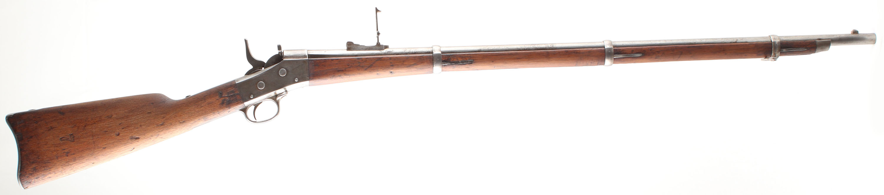 CONDITION: The two-piece, straight wrist walnut stock is very good with nicks, dings, & dents from use/age. There is a 1 1/2'' crack at the tip of the forend. There is a faded inspectors cartouche on the left wrist, left cheek, & right wrist, right cheek stamped with the rack number ''7''.The metal appears to have been buffed clean as some point. The metal is mostly gun metal gray with speckled patina, there is slightly more concentrated roughness in spots along the stock line. Left side of the receiver is stamped ''B''. The upper tang is marked with the three line 'REMINGTON'' address & patents ending in ''NOV. 7th 1871''. The left side of the chamber has a ''S'', the right is stamped ''P''. the rear sling loop has patent info on it & all barrel band stamped ''B'' on the left & right, rear band is marked ''H'' instead of ''B'' on the right. Rear sight marked ''B''. The bore is good. its bright & shiny with lightly thinned rifling & roughness. The barrel holds a worn small barleycorn front sight with a stepped base/ladder aperture rear sight marked 1 to 4 on the base & 5 to 10 on the ladder. The stock carries a steel buttplate, mostly toned gray with some brown patina. The rifle has both factory sling loops, but is missing the cleaning/clearing rod. Mechanical function appears solid. Antique, No FFL Req - Value: 1000 to 2000