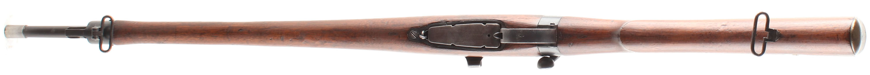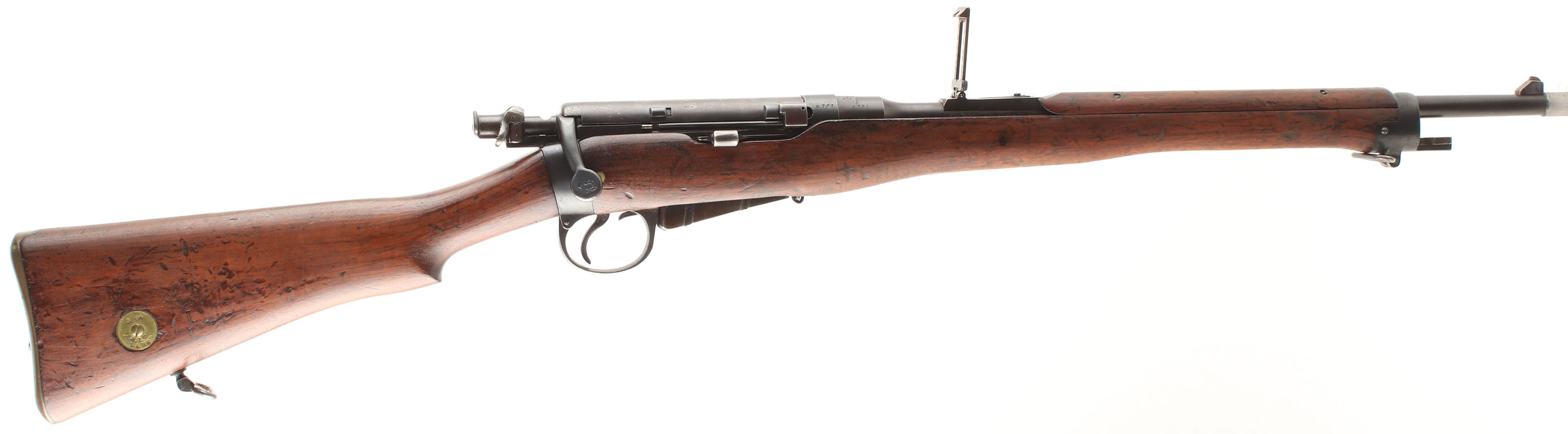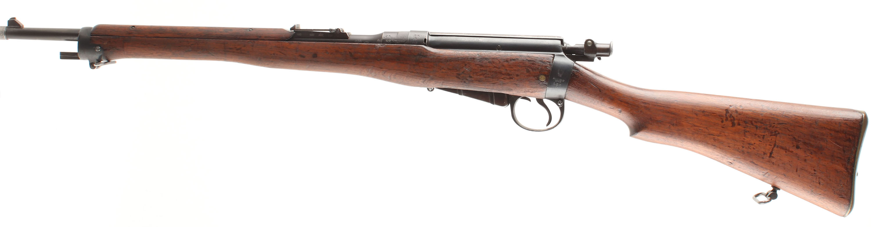 HISTORY: The standard Lee-Enfield for the infantry would be adopted in 1895, the following year a calvary carbine version would be designed & adopted featuring a shorter barrel & a smaller 6-shot magazine to make the rifle handier. In January of 1904, Britan adopted the SMLE Mk.1 which was their first short rifle having its barrel in between the standard rifle & carbine length's. This model would replace both rifles & carbines in service with one standard model for the whole military. Because of the new model adoption many of Britain's older arms would be refurbished & sold to allies, with some being converted to new models before being sold like this rifle. the R.I.C. (Royal Irish Constabulary) was the police force for all of Ireland from 1822 until 1922 when the Irish free state was formed. They would be renamed the Royal Ulster Constabulary & continued as the police force for Northern Ireland until 1998. In march of 1904 the RIC would order 10,00 carbines of their own pattern, converted from L.E.C. Mk.1 & Mk.1*, they had the front sight protector removed, the leather rear sight protector removed with the screw holes in the stock filled, cleaning rod was removed & the stock channel filled (this was done in the 1899 ''*'' update to all the service rifles), the nose cap being replaced with one that has a bayonet lug & sling swivel, the forend was shortened & reconfigured leading to wood inlets & patches, middle barrel band was removed & the retention spring slot in the stock was patched, a steel sleeve was added to the muzzle to mount the 1888 pattern bayonet, & the unit discs in the stock were marked ''R.I.C.''. In 1905, 500 more were ordered, 450 more in 1907, & finally 250 more in 1913. This rifle's unit disc is marked with the issue number ''1486'', indicating this was part of the first shipment of 2,000 rifles sent over from the 10,000 rifle, 1904 contract.