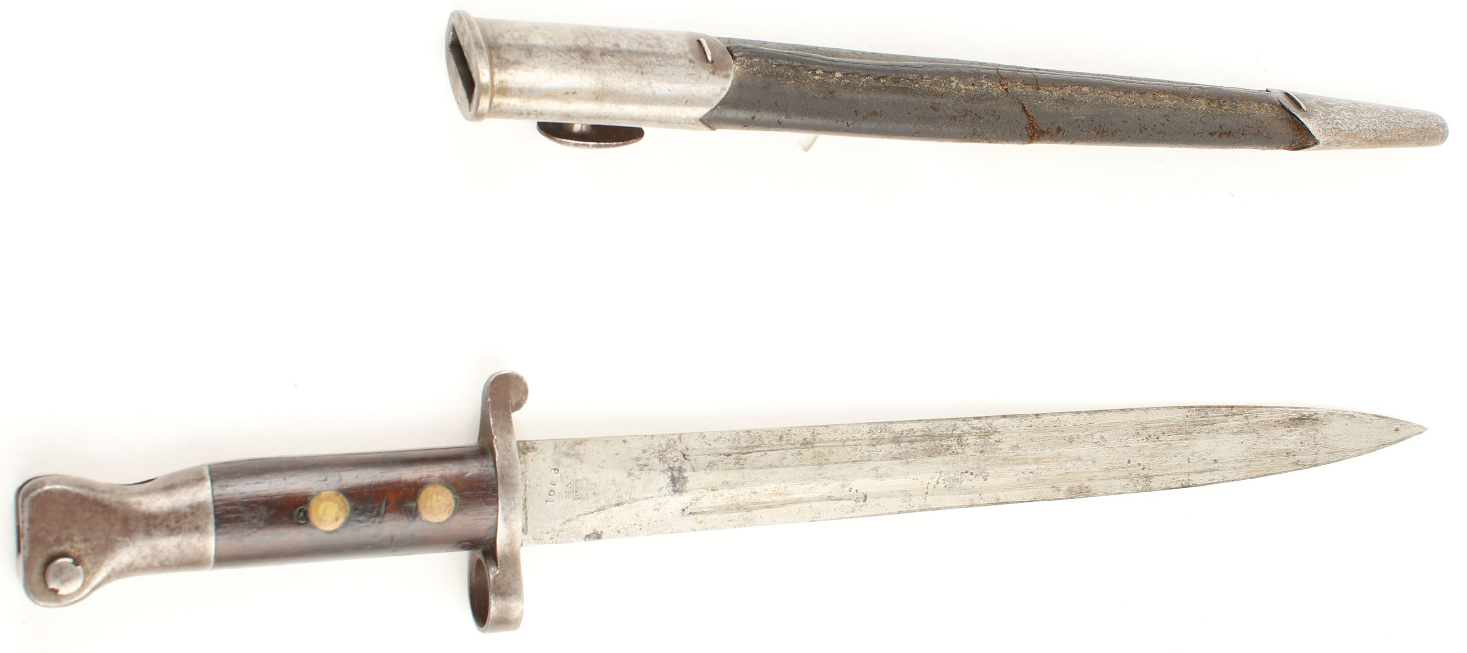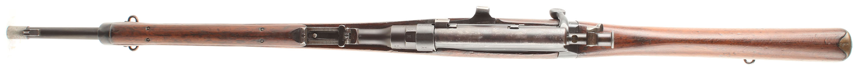 CONDITION: The semi-pistol grip, two-piece wood stock is very good with various nicks, dings, dents, & scratches from use that have been smoothed over from light sanded when it was converted, & newer dings from handling. The bottom of the forend has the wood inlay seen on R.I.C. carbines. The right cheek of the stock has brass unit disc marked ''3.04'', ''R.I.C.'' over ''1486''. Just to the right of the unit disc is the thinned remains of the original MFG stamping that reads ''R'' Crown ''M'' ''ENFIELD'' in a roundel, over ''I.'', over ''1''. The bottom of the wrist has three crown proof marks & a ''A1'' stamp. Bottom of the forend, just in front of the magazine has another thinned proof. The metal carries a arsenal refinish with thinned markings & some spots light roughness under the finish. The blued finish rates 95% on the receiver with light scuffs & wear marks. The finish on the barrel rates 90% with the chamber & end of the barrel starting to tone brown. The dust cover retains about 35% blue with spots worn gray & toning brown. The Right side of the wrist band marked with a crown over ''V.R'', over ''ENFIELD'', over ''1898'', over ''L.E.C.'', over ''I.''. The left side of the receiver band is marked with the ''sold out of service'' double broad arrow stamp, British military & commercial proofs. Right side of the receiver is marked with the S/N. The right side of the chamber is marked with the S/N & one small proof. The Left side of the chamber is marked with thinned British military proofs, fresh British military proofs, fresh British commercial proofs, & the ''sold out of service'' double broad arrow stamp. The top of the chamber marked ''E''. The top of the barrel, just behind the rear sight is marked ''S''. The sling swivels, buttplate, trigger guard, bolt handle knob, dust cover, & other smaller metal parts are marked with British proofs. S/N matching bolt. The bore is very good. Its bright with strong rifling & light roughness throughout. The barrel holds a barleycorn front sight with, as well as a ramped base/ ladder V-notch rear sight marked 200 to 500 on the left of base, & 6 to 20 on the ladder. The stock carries a brass trapdoor buttplate, nothing inside trapdoor. Stock has both bottom sling loops. Rifle comes with the correct Pattern 1888 bayonet & sheath. Bayonet S/N ''669'' dated ''8.91'' & ''X''. Mechanical function appears solid. A nice example of a rare R.I.C. Carbine. Antique, No FFL Req - Value: 1200 to 2400