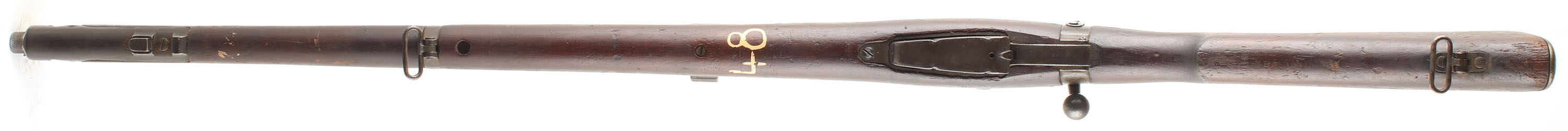 CONDITION: The semi-pistol grip, two-piece wood stock is good with various small nicks, dings, dents, & scratches from use/age. The stock has darkened from added oils. The metal is proud to the wood at the toe. The right cheek of the stock is marked ''MA'', over ''LITHGOW'', over ''SMLE'' over ''III*'', over ''1942'', as well as the S/N (markings are heavily thinned & partially visible from wear). The bottom of the wrist is marked with two heavily faded proofs. Bottom of the forend stamped ''E''. ''48'' in white paint is written on the bottom of the forend, & on the bolt body. The metal carries a arsenal refinish with thinned/faded markings & some light roughness visible under the finish. The metal has toned to a mix of green paint, thinned parkerized finish, gun metal gray, & brown patina. Right side of the wrist band marked ''MA'', over ''LITHGOW'', over ''III*'', over ''1942'' (marking is heavily faded & only partially visible). The receiver band is marked with proofs & the S/N. The top of the chamber is marked with a ''R'' in circle (denotes a replaced barrel). Left side of the chamber is marked ''MA'', over ''1942'' with many small, faded proofs. The right side of the chamber is marked with the S/N & even more small faded proofs. The safety lever is marked ''III''. Most other metal parts have small proofs. S/N matching bolt & nose cap. The bore is good to fair. Its beginning to darken with strong rifling that's thinning at the muzzle & roughness/light pitting throughout the bore. The barrel holds a square blade front sight with protective ears, as well as a ramped base U-notch rear sight marked 2 to 20. The stock carries a brass trapdoor buttplate, nothing inside trapdoor. Stock has both factory sling loops. Mechanical function appears solid. FFL or C&R Req - Value: 200 to 400