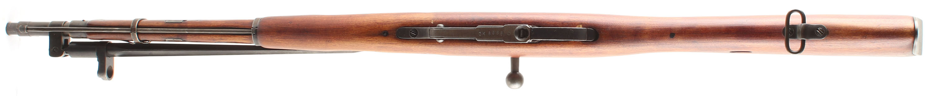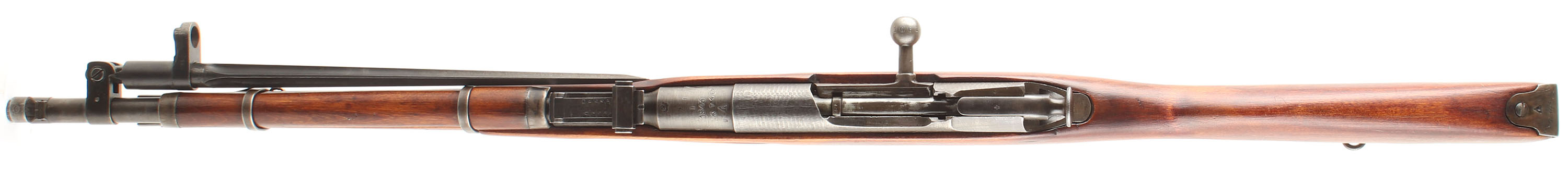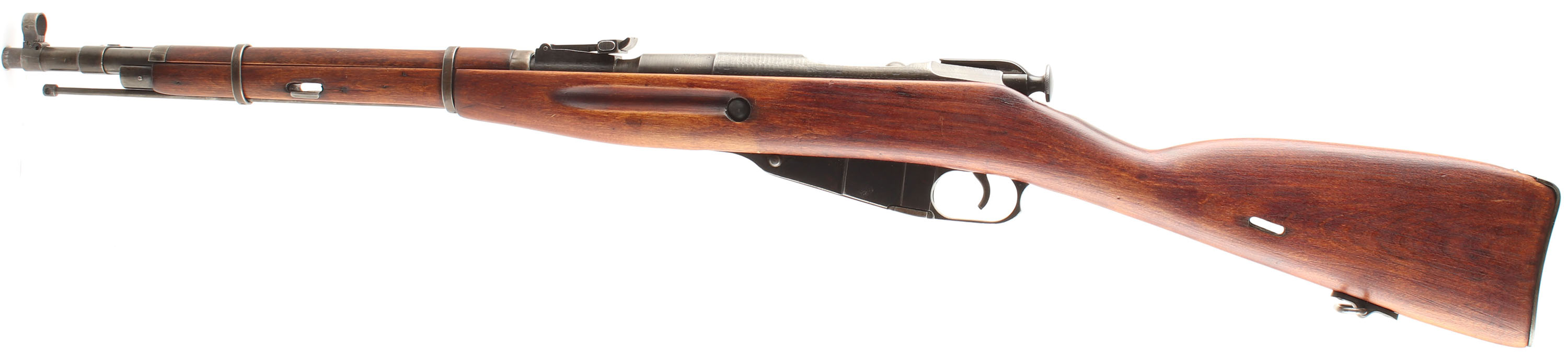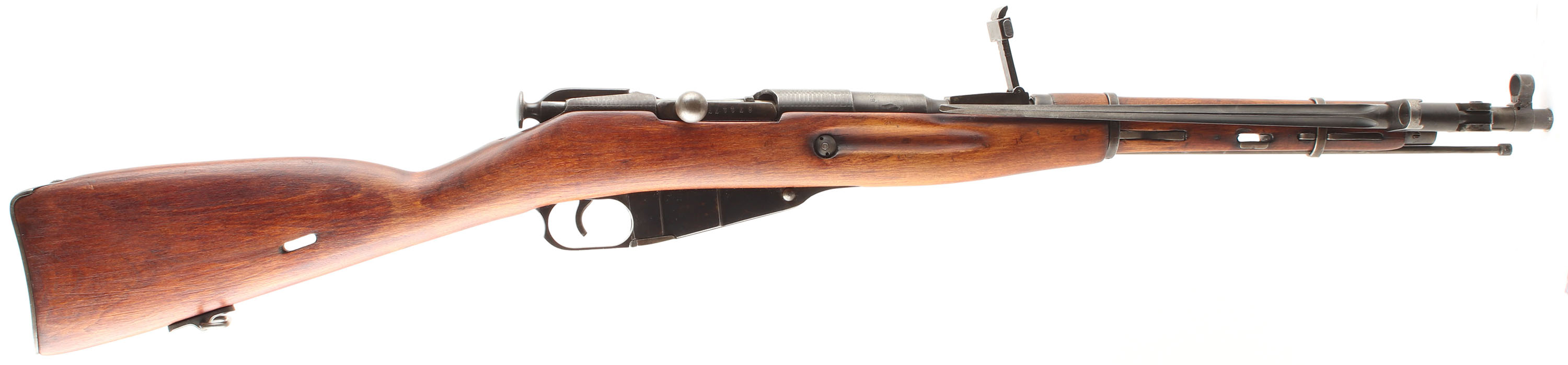 CONDITION: The straight wrist arctic birch stock is very good near excellent, as being lightly sanded & re-finished with only light superficial nicks & dings visible. Some light finish wear on the forend & wrist where its handled. One small grain pop on the left side of the forend by the sling well. The metal carries a arsenal re-finish leaving some markings thinned or faded (some are just poorly struck as well). The receiver & barrel also show rough machining marks from rushed mid war production, normal to see. The metal has toned to a mix of thinned blue & gun metal gray with speckles of brown patina on the receiver. The barrel shank is marked with a hammer & sickle in a wheat wreath over ''T'', over ''D'', over ''1943r'', over the S/N, over a arrow inside a triangle, ''SA'' in a box, another ''D'', as well as other proofs. The barrel bands have arrow in triangle stamps. S/N mismatched bolt (87117) as well as all the components of the bolt being mismatched to each other, & all other S/N marked parts(common on finish re-arsenaled guns). The bore is good. beginning to darken with light roughness throughout the bore. The barrel holds a post front sight with protective globe. The rear sight is a tangent U-notch marked 1 to 10. The stock carries a blued steel buttplate, toned to a mix of thinned blue, brown patina & gun metal gray. The stock has both factory sling wells as well as a added rear loop in the belly of the stock (unknown if its Finnish or after the fact). Rifle has a cleaning rod & the affixed, folding cruciform bayonet. Mechanical function appears solid. a rare & unique Mosin being both a early field trials rifle & being Finnish captured. FFL or C&R Req - Value: 600 to 1200