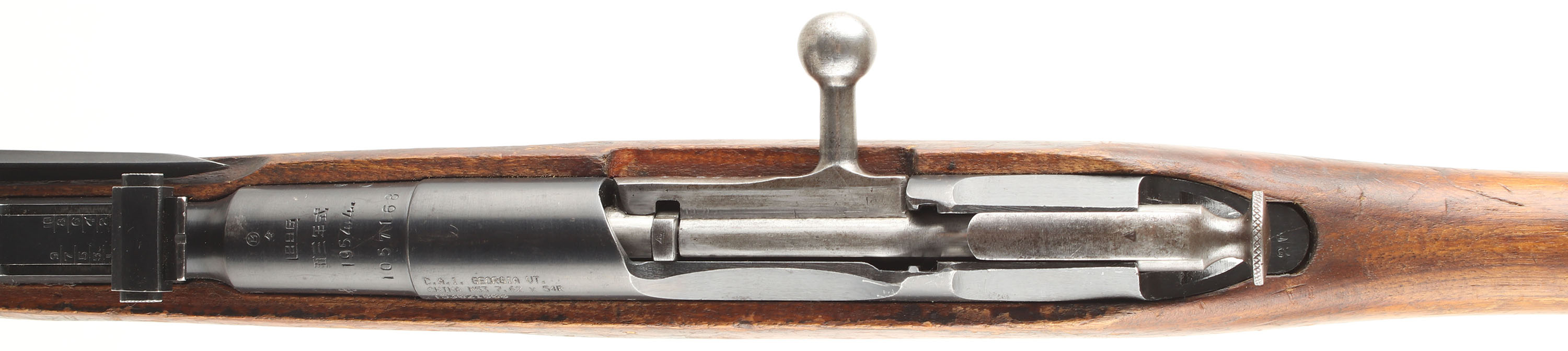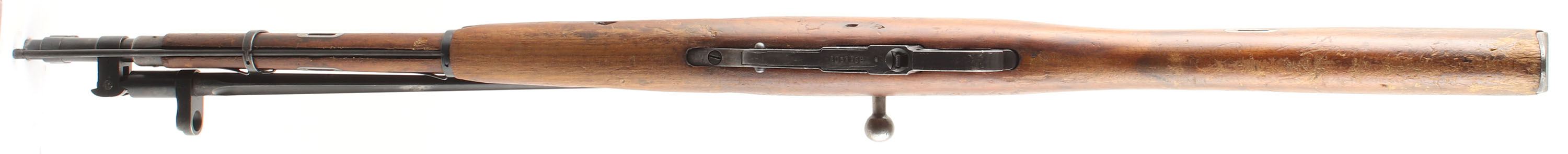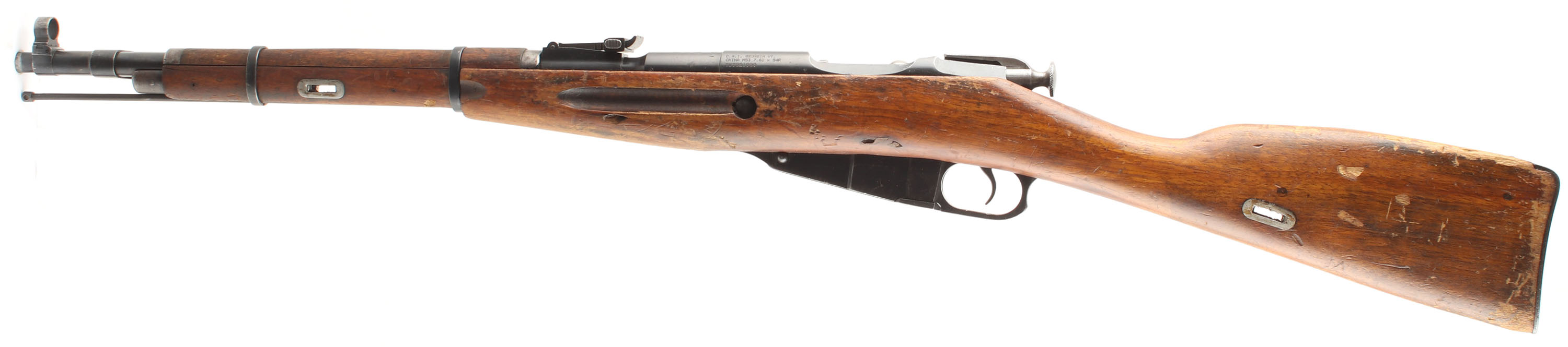 CONDITION: The straight wrist Chu wood stock is good with small nicks, dings, dents, scratches, & wear from use/age. Common handling spots have worn away the finish. There are many small worn cartouches on both cheeks of the stock, around both sides of the recoil lug, bottom of the wrist, top of the comb, & one faint stamp on the forend. The metal does not appear to have an arsenal refinish, but has some poorly struck markings that are not fully visible. The blued metal finish rates 96% on the receiver with light scratches & a couple speckles of rust. The finish on the barrel rates 93% with some light scratches & spots of wear on the top of the chamber & end of the barrel. Top of barrel is marked with a ''B'' like symbol in a circle, over ''H'', over ''296'' in a half box, over ''TYPE 53'' in Chinese, over ''1954.4'', over S/N, as well as a assortment of proof marks. Left side of receiver is marked with ''C.A.I.'' importer marks. Top of rear tang & buttplate tang have the same poorly struck ''20'' mark. S/N mismatched bolt (Russian with Izhevsk marked components). S/N matching magazine floorplate, & buttplate. Bore is good. has strong rifling but with light rust & roughness throughout the bore. Barrel holds a post front sight with protective globe, & a tangent U-notch rear sight marked 1 to 10. The stock carries a blues steel buttplate, worn gray on shoulder wear spots & has light brown patina speckling. Stock has factory sling wells & comes with a period correct, Chinese canvas sling with leather dog collars. Rifle has a cleaning rod & the affixed side folding, cruciform bayonet. Mechanical function appears solid. FFL or C&R req - Value: 250 to 500