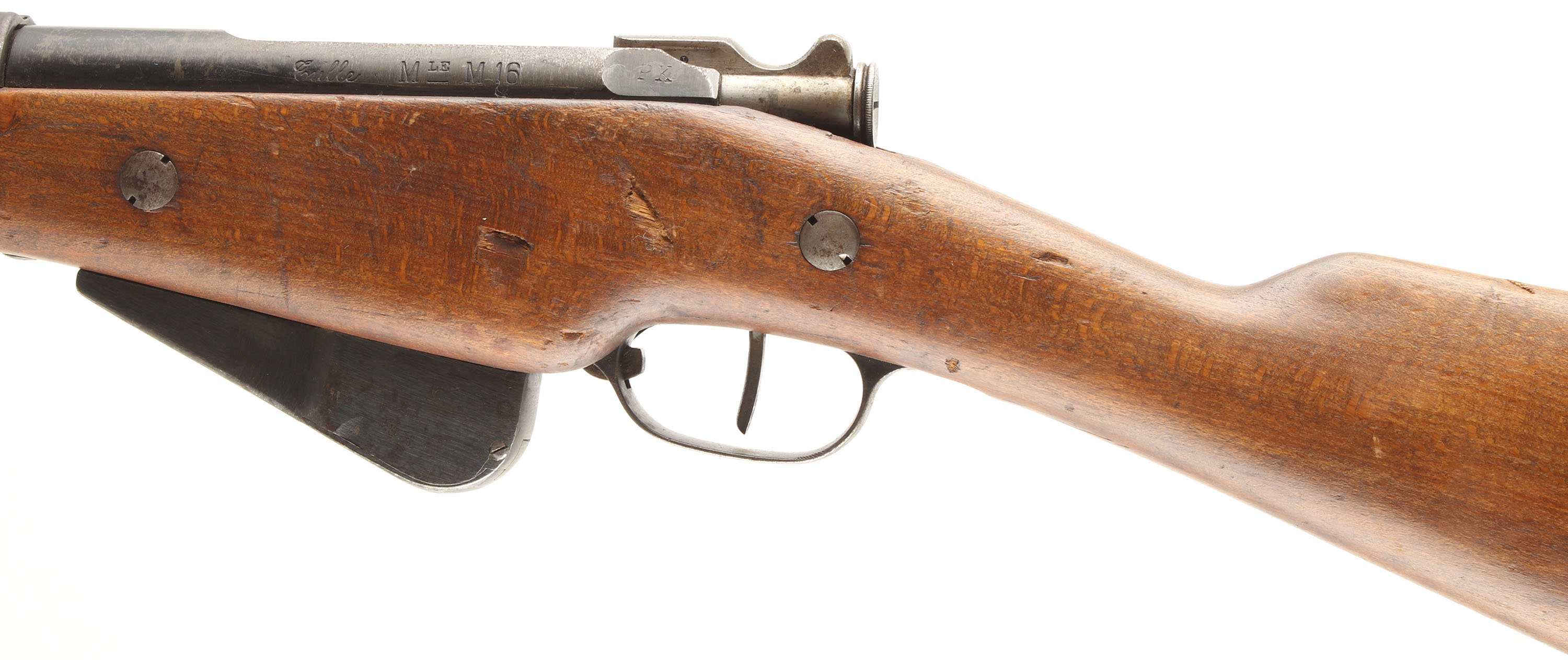 CONDITION: The straight wrist Beech stock is very good as being lightly sanded & oiled. Stock does have some nicks, dings, & gouges from use. There is a small grain pop at the top of the wrist emanating from the receiver, & one on the top of the comb emanating from the buttplate. The right cheek of the stock has a heavily faded roundel acceptance cartouche that's illegible. The S/N is stamped into left cheek of stock. Bottom of the wrist marked with a faded ''A''. The receiver carries a arsenal refinish with some thinned markings. The Parcosel finish rates 70% overall with spots of wear toning brown & spots of rust & roughness. The left side of the receiver is marked ''TULLE'' ''MLE M16'' & ''PK'' (indicates it was made or rebuilt at Chatellerault between 1934-40 & received the ''Parcosel'' paint finish). The top of the receiver band & chamber is marked ''N''. The left side of the chamber is marked ''MM'', ''C'' in circle, ''M'' in circle, over the S/N. (S/N stamp has no finish behind it, the original S/N was stamped into a new barrel if it was ever replaced, they were already finished before they were stamped). The right side of the chamber is marked ''MA C 1934'' (means it was made at Chatellerault in 1934). The bottom of the magazine hole cover is stamped with a small ''MAC'' in a rectangle. S/N matching bolt & trigger guard. The bore is very good. Its bright & shiny with strong rifling & light roughness throughout the bore. The barrel holds a large block front sight with a groove cut in the top. The rear sight is a stepped base/ladder, deep square notch sight. These are the war time designed larger sights for quicker target acquisition over the older post sights. These started showing up on rifles late 1914 to early 1915. The stock carries a steel buttplate, left in the white. Buttplate has light patina. The rifle has both factory sling loops. Mechanical function appears solid. FFL or C&R Req - Value: 500 to 1000