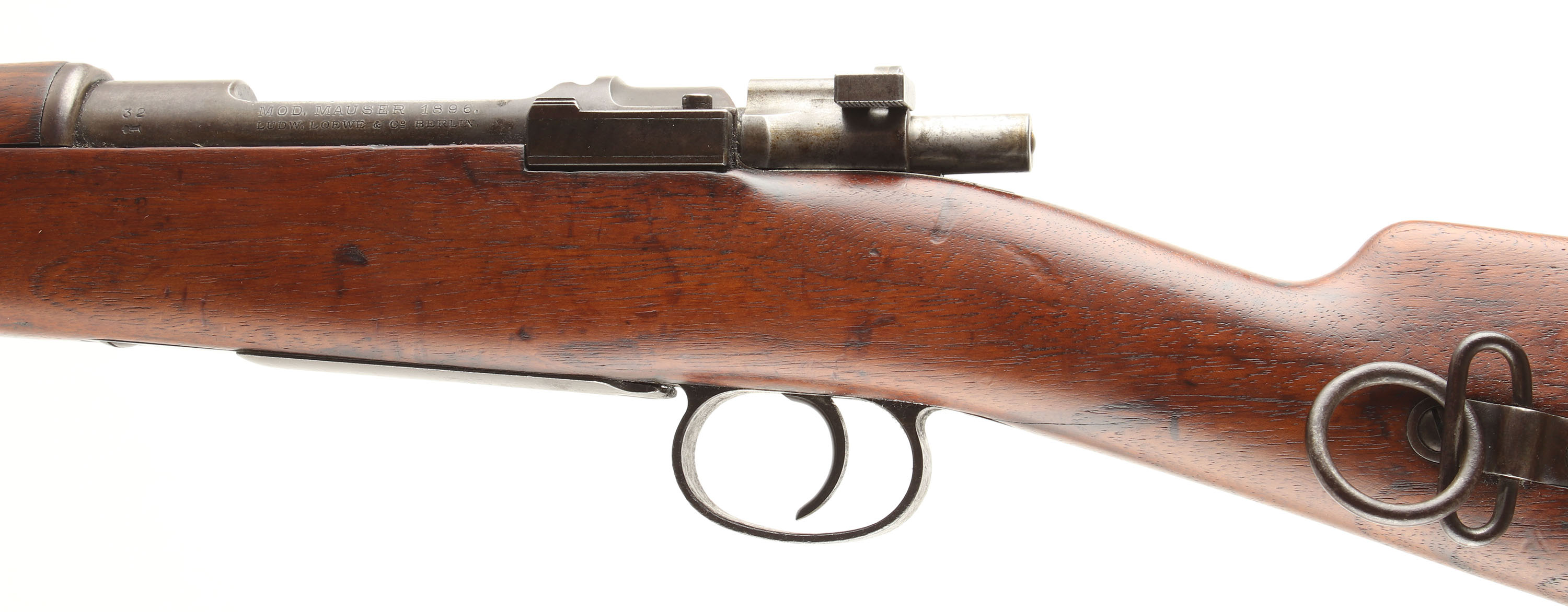 CONDITION: The straight wrist walnut stock is very good with some nicks, dings, & scratches from use that have been smoothed over from handling over time. The buttplate is slightly proud to the wood at the toe & in a couple spots around the plate. there is some oil staining by the buttplate from being oiled & stored muzzle up for a long time. There is a 1'' tight crack 0n the bottom of the wrist, emanating from the trigger guard. The right cheek of the stock is marked ''L.D.''. The metal has mostly toned to a brown patina with a spots of gray, & spots of thinned blue remaining protected areas. light roughness visible on some metal parts. the left side of the receiver is marked with the S/N over a German crown proof, ''MOD, MAUSER 1896.'', over ''LUDW. LOEWE & CO BERLIN.''. S/N matching bolt (faint & under some roughness), magazine floorplate, magazine/trigger guard assembly (this & previous marking are thinned), rear sight ladder & elevator. S/N mismatched cleaning rod. The bore is very good. It's bright with strong rifling, light roughness through the bore & slightly more concentrated roughness in the grooves. The barrel holds a barleycorn front sight with a flip up V-notch ladder rear sight marked 4 to 14. The stock carries a steel buttplate. starting to tone brown with some spots of roughness. The rifle has both factory left side sling loops with a saddle ring on the rear loop. Rifle has a cleaning rod & comes with a slip on front sight protector. Antique, No FFL Req - Value: 1000 to 2000