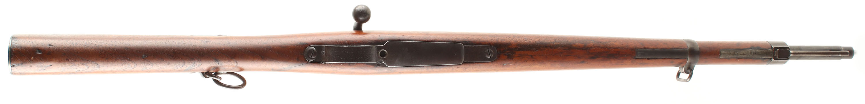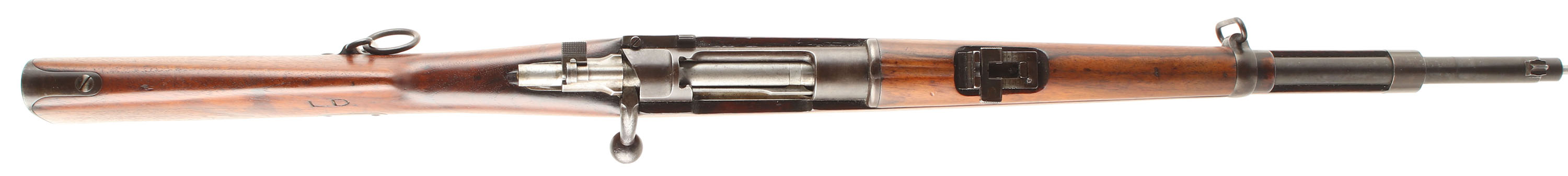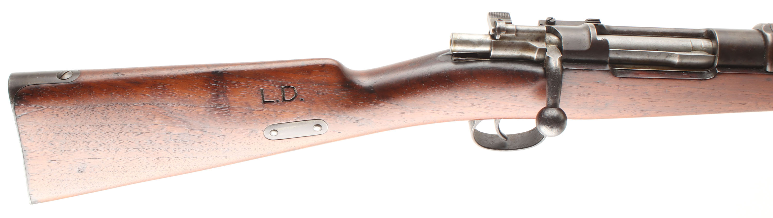 HISTORY: Before the 2nd anglo-Boer war the ZAR ''Zuid Afikaansche Republiek'' (South African Republic) & the OVS ''Oranje Vrij Staat'' (Orange free state), were buying Mauser rifles from Ludwig Loewe & co (later DWM) in order to arm the Boer forces. Rather uniquely, the governments sold the rifles to the soldier instead of issuing them. This led the Boers becoming extremely effetive with their rifles since they used that exact rifle in their day-to-day normal lives before the war, either hunting or competition. This also led to soldiers customizing their rifles stock with names, places they've been, or just decorative designs. The Majority of the rifles bought by these governments would be marked as such either on the stock or the receiver, however many unmarked examples made their way into Boers hands & were used with them starting to stockpile rifles just before the war with growing tensions. This example does not bear any ''OVS'' or ''ZAR'' markings, but does have what appears to be initials ''L.D.'' etched into the stock in the Boer fashion, & with being a very early S/N being marked MOD 1896 its most likely a early shipment carbine that did not get marked.