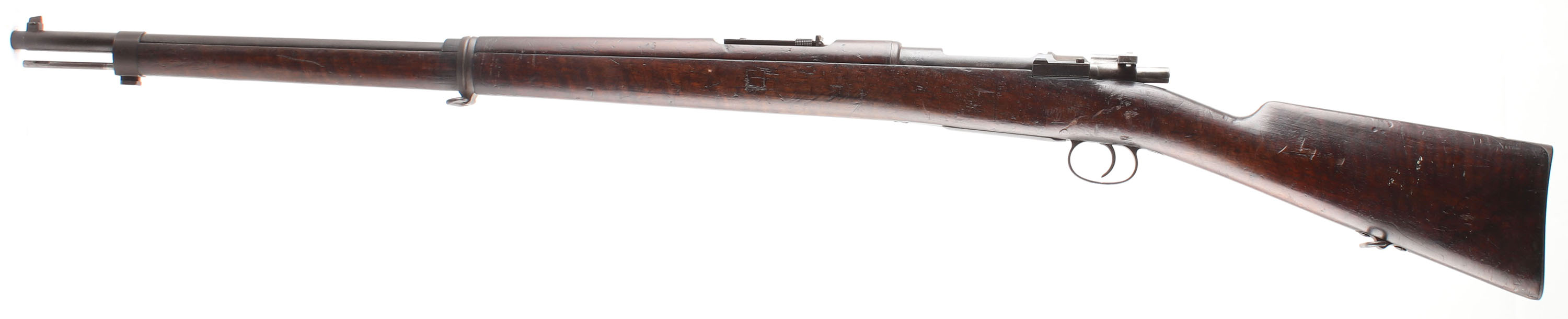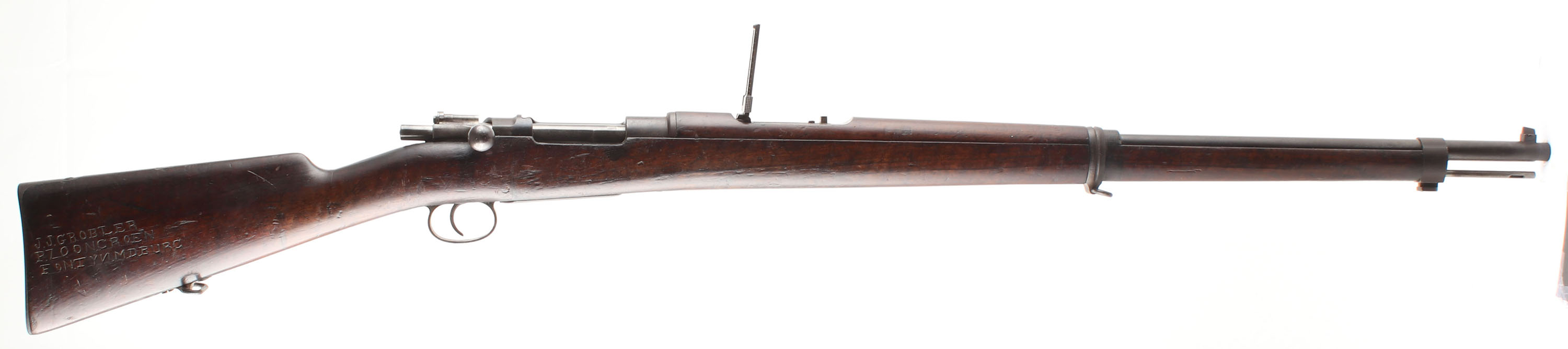 CONDITION: The straight wrist walnut stock is very good with some nicks, dings, & scratches from use that have been smoothed over from handling over time. The right cheek of the stock is carved ''J.J. GROBLER'', over ''P.ZOON.GROEN'', ''FONTYN.M.D.BURG''. right next to the carvings is a slightly thinned German cartouche. The metal has toned to mix of a brown patina & thinned blue with roughness across the metal & spots of cleaned pitting on the barrel. the left side of the receiver is marked with the S/N next to a German proof, ''DEUTSCHE WAFFEN-UND MUNITIONSFABRIKEN.'', over ''BERLIN''. S/N mismatched bolt (4208), & cleaning rod. S/N matching magazine floorplate, magazine/trigger guard assembly, rear sight ladder & elevator. The bore is poor. Its dark with roughness & pitting throughout, still has visible rifling through the bore. The barrel holds a barleycorn front sight with a flip up V-notch ladder rear sight marked 4 to 20. The stock carries a steel buttplate. Plate has toned brown with roughness. The rifle has both factory bottom sling loops & comes with a cleaning rod. Antique, No FFL Req - Value: 1000 to 2500