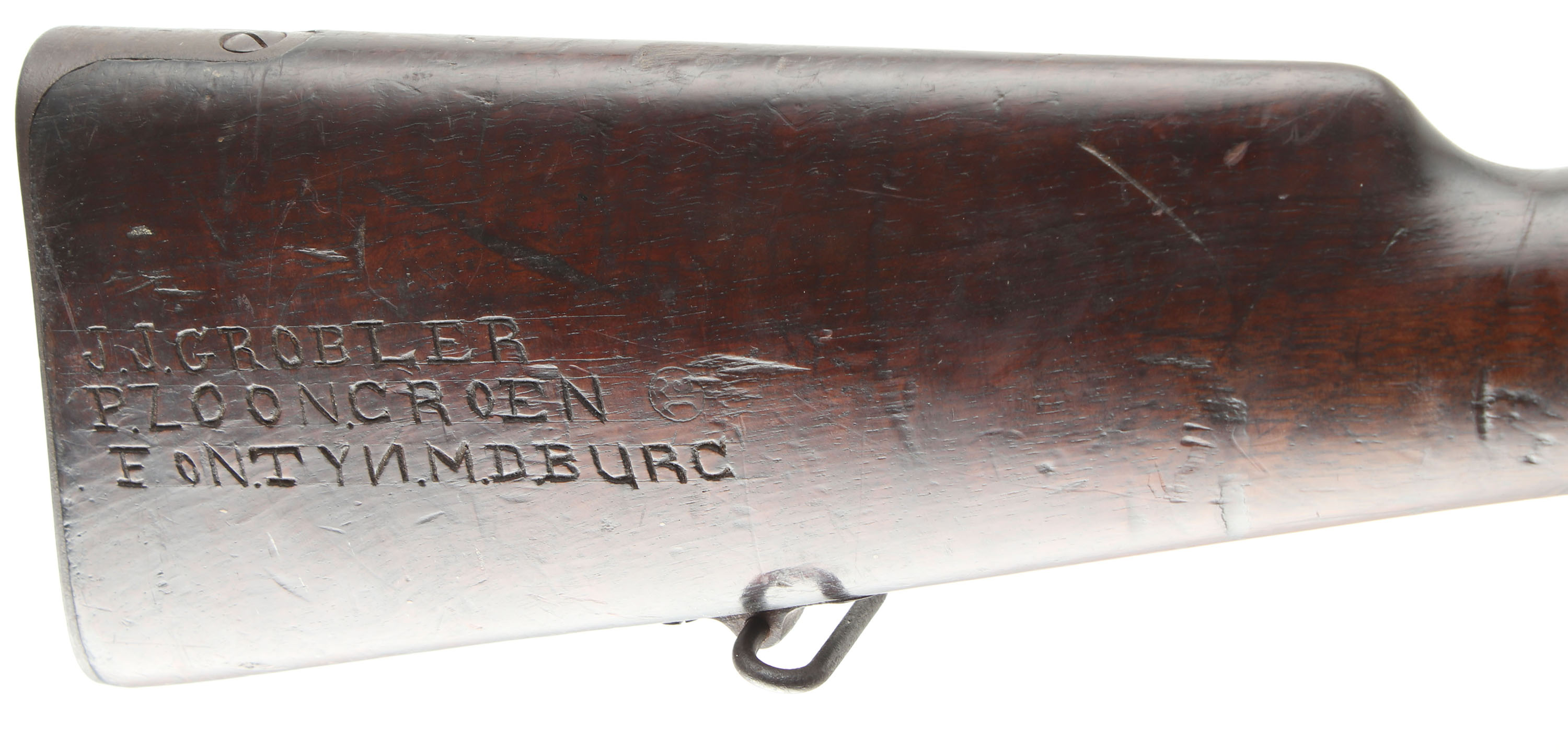 HISTORY: This rifle was owned & used by Boer Burgher Jacobus Johannes Grobler. He was born on the 1st of march, 1884 at Bosmanskraal, Transvaal, South Africa. He joined the Middelburg Commando on Jan 5th 1900 at age 15. His commanding officer was captain Trichardt. J.J Grobler was the nephew of General Grobler & Commandt H.S. Grobler of Middleburg. He saw action with the Middleburg Commando in Natal & the Transvaal. The Australian forces were documented as fighting against the Middleburg Commando's. J.J. Grobler was taken prisoner in 1902 & sent to Ladysmith POW camp. He would apply for & receive the Anglo-Boer war medal (Medalje voor de Anglo-Boere Oorlog) in 1923. He would die at 60 years old on July 12, 1944. This rifle comes from the Famous Mike Carrick Collection & comes with some of his research information on the rifle & J.J. Grobler. This rifle was also featured in Dave C George's book ''Carvings from the Veldt'' on page 58 Fig 52.