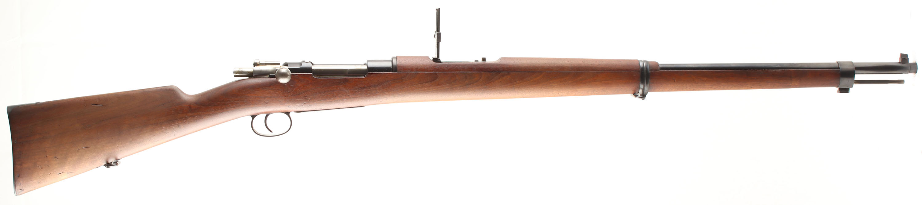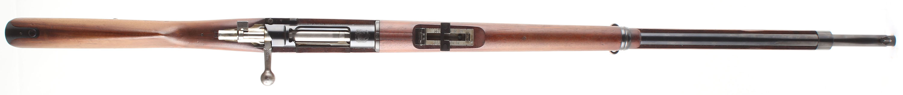 CONDITION: The straight wrist walnut stock is very good near excellent with superficial nicks, dings, & scratches. a couple vice marks present on stock. The left cheek of the stock is stamped with the Chilean acceptance stamp of the Chile coat of arms over ''1895''. The left side of the stock is stamped with the S/N, just below the S/N marking on the receiver. Small cartouche on the upper handguard. All markings are crisp & legible with exception to the acceptance stamp, its worn on the bottom edge. The metal carries a beautiful arsenal deep blue re-finish with only minor thinning of some markings & almost no visible roughness under the finish. The blued metal finish rates 99% on the receiver & 98% on the barrel with a few spots of light thinning overall with a few spots of light thinning & one small spot of roughness on the top of the barrel. The left side of the receiver is marked with the S/N, two proof marks, ''MAUSER CHILENO MODELO 1895'', ''MANUFACTURA LOEWE BERLIN.''. The top of the receiver is stamped with the Chilean coat of arms. Other metal parts have various proof marks. S/N matching bolt (& its components), magazine floorplate, trigger guard/magazine housing, & cleaning rod. The bore is excellent. Bright & mirrorlike with little to no visible wear. The barrel holds a barleycorn front sight with a flip-up ladder, V-notch rear sight marked 5 to 20. The stock carries a blued steel buttplate with finish wear around the edges. The rifle has both bottom sling loops & has a cleaning rod. a beautiful condition Chilean Mauser. Antique No FFL Req - Value: 500 to 1000