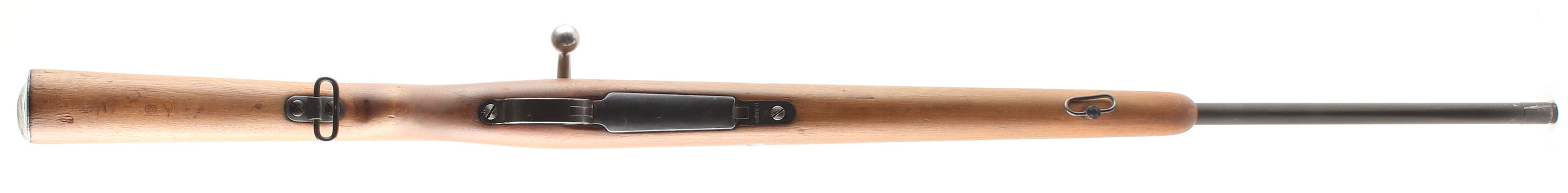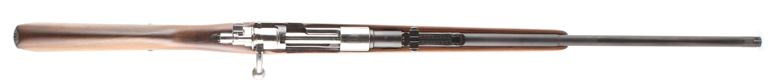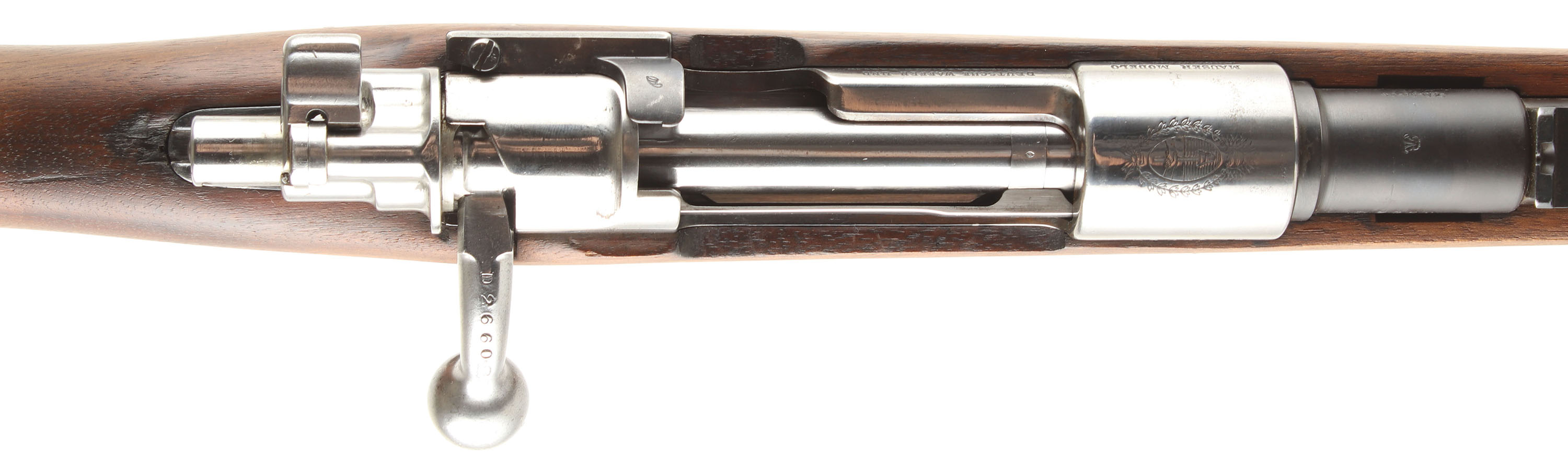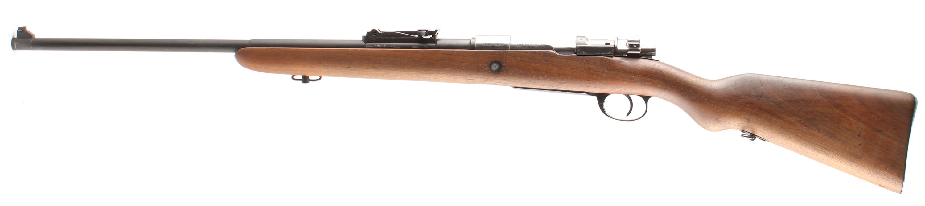 CONDITION: The cut down & shaped, semi-pistol grip walnut stock is excellent with only a couple superficial nicks, dings, & scratches. stock was lightly sanded & oiled when it was cut down leading to the military cartouches being thin. Wood plug in the cleaning rod channel where it was cut down. The right cheek of the stock is marked with a Argentina coat of arms roundel stamp. There is one faint crest cartouche on the bottom of the wrist & three more faint stamps in the belly of the stock. The right flat of the stock just in front of the recoil lug is stamped with a mismatched S/N ''C2251''. The barrel carries a old arsenal re-blue with some spots of roughness under the blue. The barrel's finish rates 90% with some scuffs/scratches. The receiver was left in the white (unfinished) from the factory, it has been buffed clean at some point with a couple small spots of roughness & thinned markings especially the crest. The left side of the receiver is marked ''DEUTSCHE WAFFEN-UND'', ''MUNITIONSABRIKEN. BERLIN''. The left side of the receiver band is marked ''MAUSER MODELO'', ''ARGENTINO 1909'', the top is marked with the marked with the Argentina coat of arms, the right side is marked with the S/N. The left side of the chamber was double stamped ''CAL 30-06''. The right side of the chamber is marked with the S/N & the top is marked with a proof. S/N matching bolt, barrel, & trigger guard/magazine assembly. The bore is good to very good. its bright with solid rifling but has continuous roughness throughout the bore. The barrel holds a barleycorn front sight with a tangent V-notch rear marked 3 to 20. The stock carries a steel buttplate left in the white, has rust speckling. The rifle has the factory rear sling loop & an aftermarket front swivel. Mechanical function appears solid. FFL or C&R Req. - Value: 200 to 400