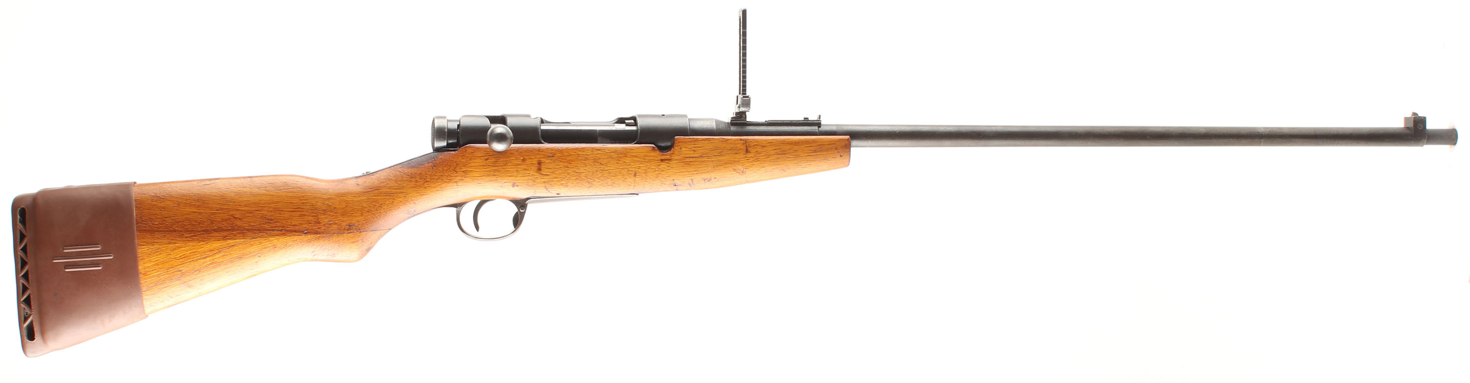 CONDITION: The semi-pistol grip Japanese Walnut (Oni-gurumi or Siebold walnut) stock is very good as being cut down, shaped, lightly sanded & refinished. There are still present deeper dings/gouges from after the refinish, as well as some newer nicks, dings, & scuffs from after. Two-piece Japanese buttstock. Inside of the rear sling cutout is marked ''W''. The metal carries a old thin re-blue that retains almost full coverage but is toning to a mix of gray & brown patina with speckled rust & spots of roughness from cleaned pitting present on the barrel. Some spots of deeper blue are still present at the rear of the receiver. The receiver band is marked with a INTACT chrysanthemum (Most were ground off when surrendered rifles as a face-saving gesture), over ''TYPE 38'' in Japanese. The left side of the receiver is marked with the series mark, the S/N, the Nagoya arsenal logo, & Japanese inspectors marks. The left side of the chamber is stamped ''300'' over ''SAV.'' (the barrel was shortened at the chamber end as part of the re-chamber to 300 Savage). The barrel appears to be a later type 99 barrel that was fitted to a type 38 Rec. with a late production 99 style front sight but with the older type 38 rear sight. The barrel is the same length as a factory type 99 from where the chamber tapers down to the barrel, to the muzzle. S/N matching bolt. The bore is good. It's bright & shiny with thin rifling & a couple spots of roughness. The barrel holds a barleycorn front sight & a flip up ladder, V-notch rear sight marked 4 to 24. The stock carries a blued steel cupped buttplate that's worn gray with speckles of brown patina & over applied stock lacquer on the sides. The rifle has no sling mount or a cleaning rod. Rifle does come with a rubber slip on recoil pad/LOP extender. Mechanical function appears solid. FFL or C&R Req - Value: 150 to 300