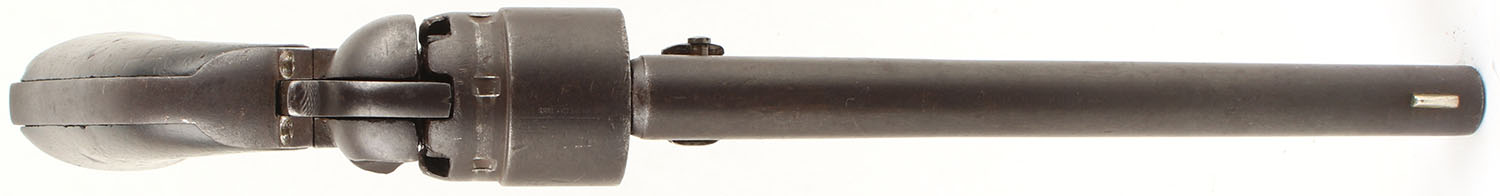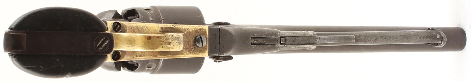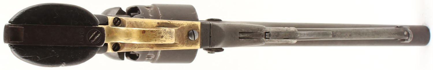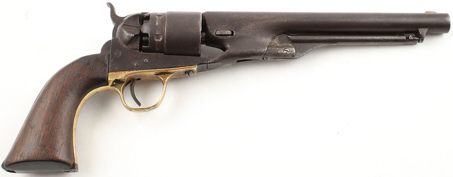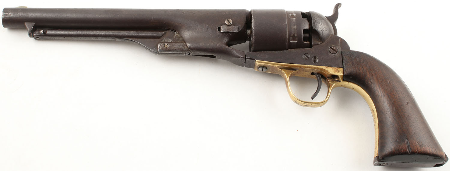 Colt, Model 1860 Army, CAL: 44, MFG: 1862, SN: 60457, Single Action Percussion Revolver, 7 7/8'' barrel. Civil War Era. The top of the barrel has a standard single line roll-stamp that is very worn & thinned, the beginning & end of the marking is visible but most of the marking in the middle has worn to the point that it is no longer legible. ''COLTS PATENT'' is stamped on the left side of the frame. No visible caliber marking. The Naval scene on the cylinder is not visible. All matching SN on the barrel housing, frame, trigger guard, & backstrap. There is a cartouche behind the trigger guard reading ''H''. The wood grips are very good, near excellent, solid having some contusions, dings, & scratches throughout. The grip has several small edge chips, most notably a gash near the bottom of the grip on the left side. The metal on the gun has evenly toned to a chocolate patina. Bore is fair, the rifling is strong but unevenly worn near the muzzle. The bore has darkened substantially with even roughness throughout & light pitting. Mechanically fair, some of the mechanical functionality seems to have been lost. The trigger functions properly & the hammer has the first three clicks but will not fully lock in the rearward position. The cylinder does not solidly lock into position & will quite easily rotate clockwise. Antique, No FFL Req. - Value: 1000 to 2000
