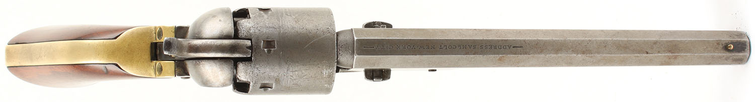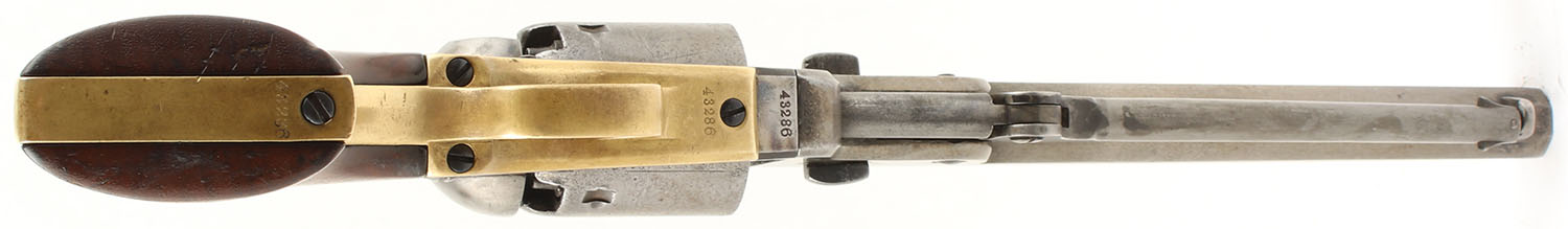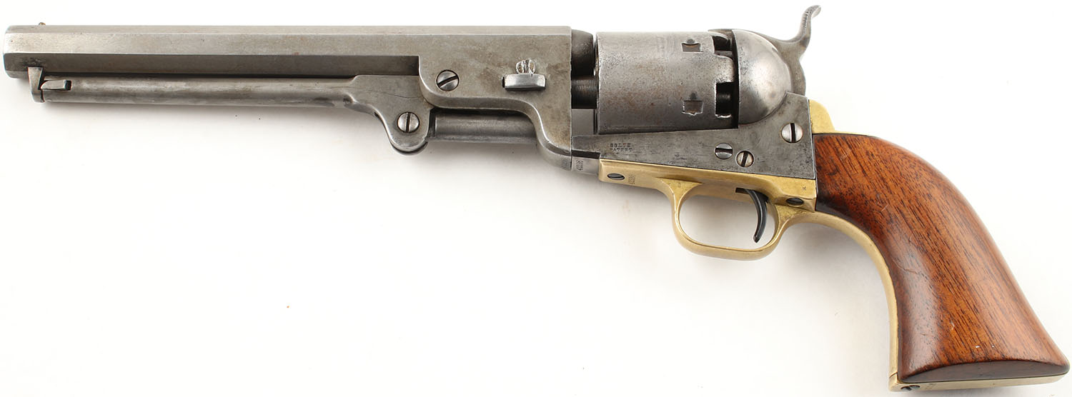 Colt, Model 1851 Navy, CAL: 36, MFG: 1855, SN: 43286, Single Action Percussion Revolver, 7 1/2'' barrel. The top of the barrel has a standard single line roll-stamp that reads ''ADDRESS SAM L COLT NEW YORK CITY''. ''COLTS PATENT'' is stamped on the left side of the frame, this stamp has begun to wear thin but is still fairly legible. No visible caliber marking. The Naval scene on the cylinder is worn thin but is still approximately 50% visible with the text on the cylinder being thinned & mostly legible with only one or two characters that are obscured. All matching SN on the barrel housing, frame, trigger guard, & backstrap. There is a nonmatching serial number on the barrel wedge that reads ''3588''. The wood grips are excellent, solid with minimal wear. The metal on the gun is mostly gun metal grey with a very thin splotchy brown patina throughout. The brass on the gun is very nice & slightly tarnished but would likely clean up nicely. Bore is poor to fair, the rifling is fairly strong but the bore has darkened substantially with even roughness & pitting throughout. Mechanically solid, seems to function properly. All four clicks seem to be present. Antique, No FFL Req. - Value: 1200 to 2400