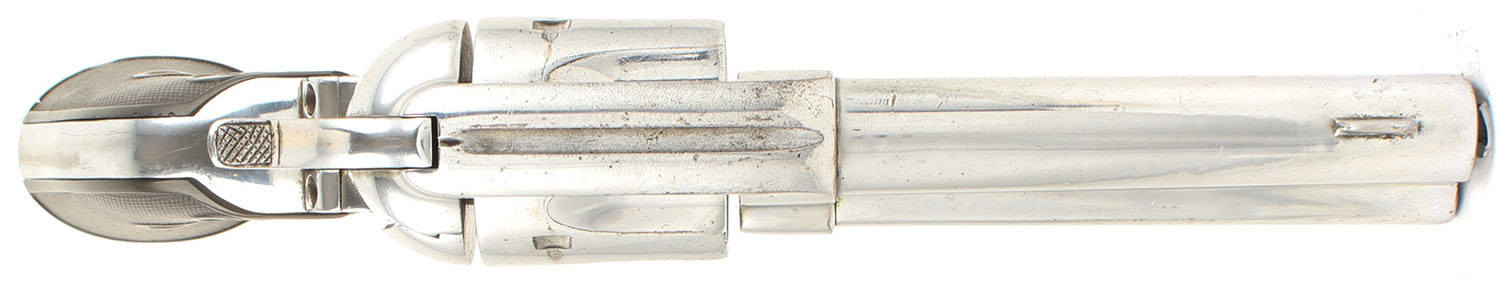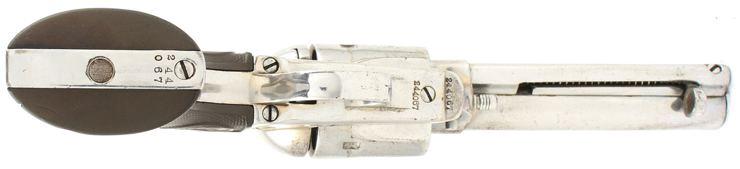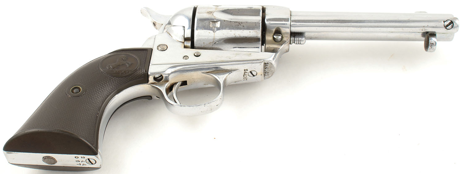 Colt, Single Action Army, CAL: 45 Colt, MFG: 1903, SN: 244067, SAO Revolver, 4 3/4'' Barrel. The checkered vulcanized rubber Colt grips with Rampant Colt logos are excellent with some wear from use. The checkering is slightly thinned with some small dings & scratches throughout. The metal holds a non-factory nickeled finish. The nickel finish on the gun is good to very good with some gun metal grey exposed. There is some light brown patina in hard to reach areas around the gun. There are substantial drag lines on the cylinder. The gun appears to have been substantially buffed in the refinish process thinning the markings. The only markings on the barrel is a non-legible & a barely visible ''45 Colt'' on the left side. The two line patent roll stamp & rampant colt logo on the left side of the frame is slightly faded but still visible & legible. The serial numbers on the frame, trigger guard, & butt of the grip match & are all visible & legible but slightly faded. Bore is fair to good, the rifling has thinned but is still pronounced & the bore is dark with even roughness throughout with substantial pitting concentrated near the center of the barrel. Mechanically solid, seems to function well. The action has all four distinct clicks that one would expect from a SAA. The clicks in the action are very tactile & audible, the action feels tight. A fixed front sight is integral to the barrel, a rear sight notch is cut into the frame. FFL or C&R Req. - Value: 1000 to 3000