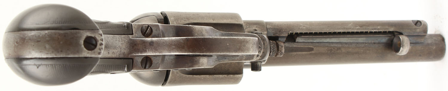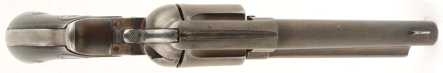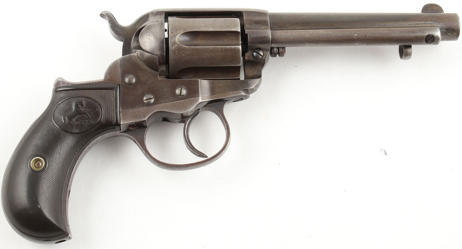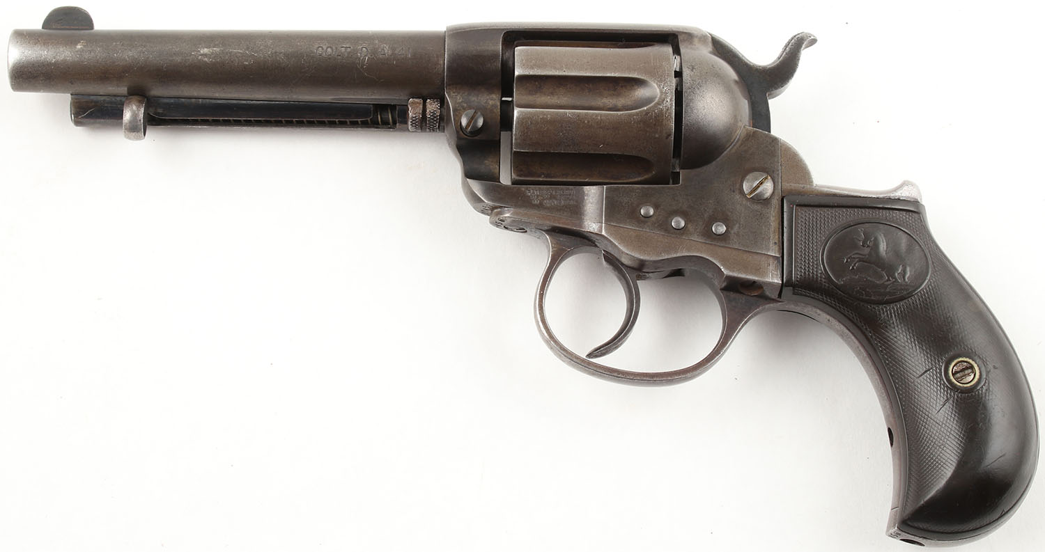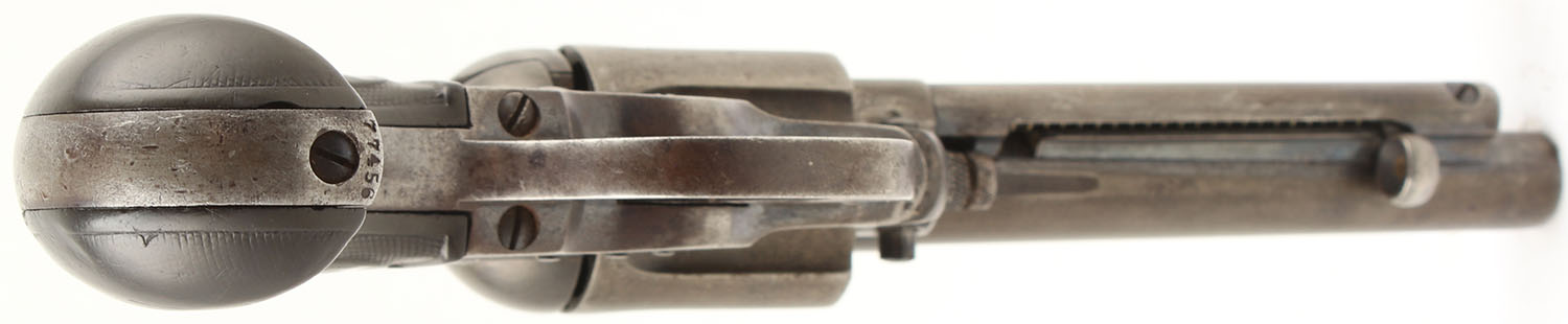 Colt, M1877 D.A. ''Thunderer'', CAL: 41 Long Colt, MFG: 1890, SN: 77456, DA/SA Revolver, 4 1/2'' Barrel. The checkered vulcanized rubber birds head grips with Rampant Colt logos are good to very good, solid with approximately half of the checkering worn smooth & some small scratches & dings throughout. The original blued finish on the gun has worn thin & toned to a brown patina. The gun has near total coverage with some exposed gun metal grey concentrated in high wear areas like the front strap & backstrap of the grip. There are some small areas with remainders of original blue in protected areas, most notably near the trigger guard & ejector housing. All of the markings on the gun are visible & legible & the serial numbers on the frame, backstrap, & trigger guard are matching. Bore is good, the rifling has thinned slightly but is still very pronounced. The bore has darkened with even roughness throughout. Mechanically solid, seems to function well. A fixed front sight is integral to the barrel, a rear sight notch is cut into the frame. Antique, No FFL Req. - Value: 500 to 1000