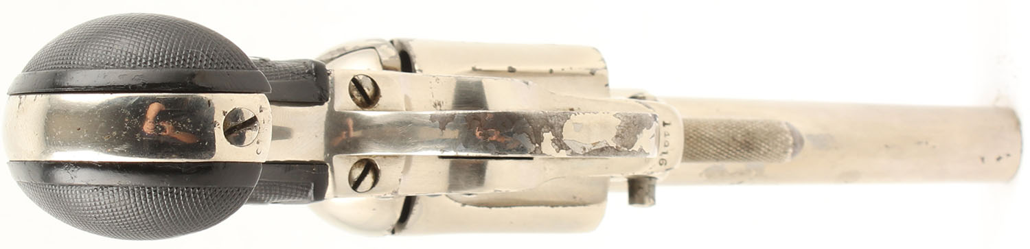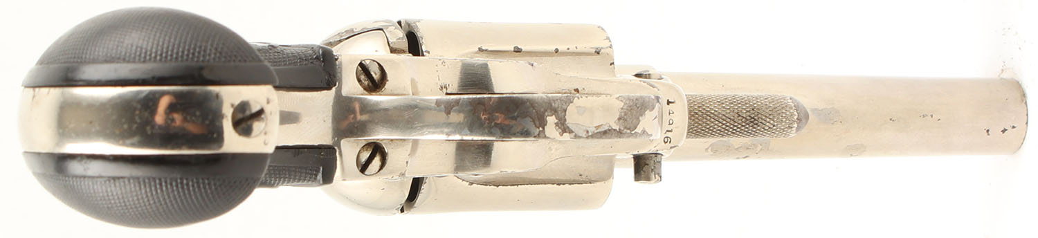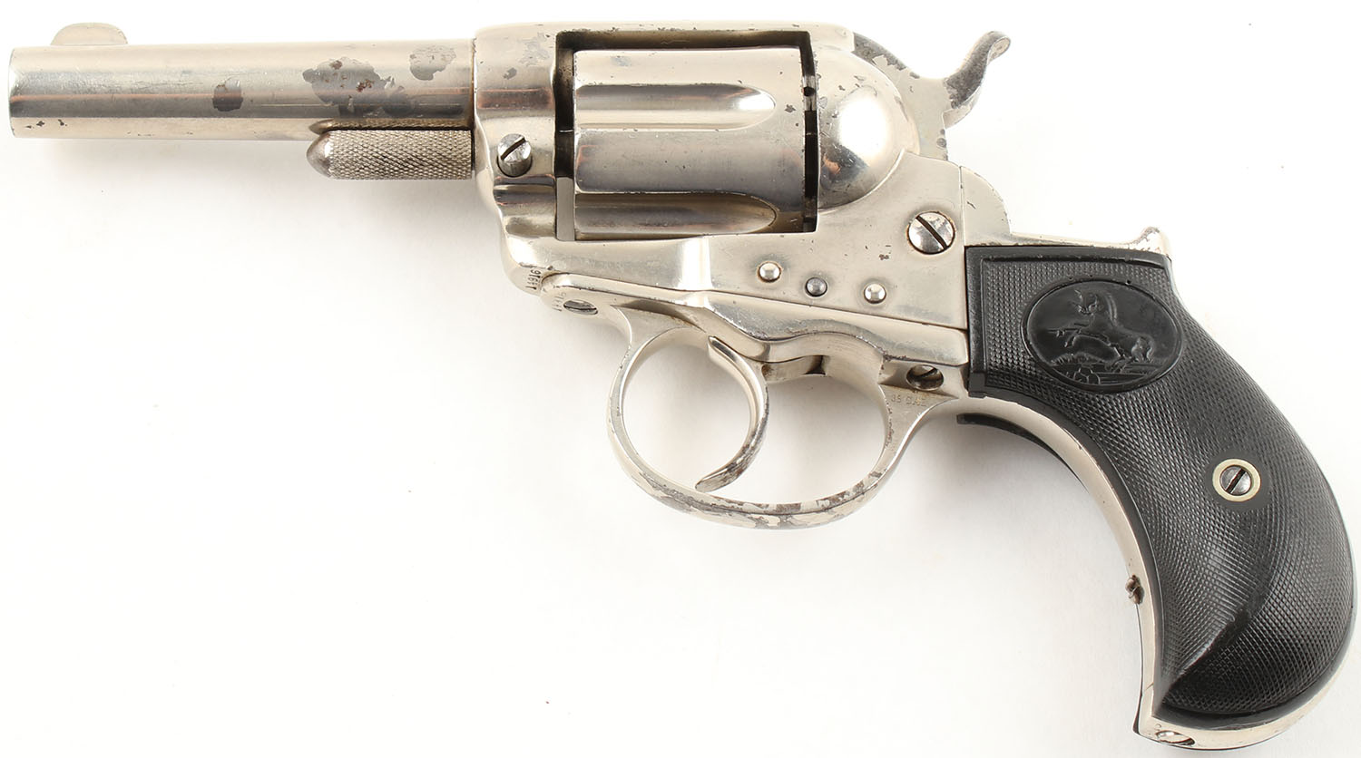 Colt, M1877 D.A. ''Lightning'', CAL: 38 Long Colt, MFG: 1879, SN: 14916, DA/SA Revolver, 3 1/2'' Barrel. The checkered plastic birds head grips with Rampant Colt logos are very good, near excellent, solid with some handling wear. There are some small scratches & dings throughout, there is one large scratch on the right grip panel going from the bottom of the Colt logo to the edge of the grip near the trigger guard. The nickeled finish on the gun is fair, the finish has worn & flaked to a mix of gun metal gray & nickeled finish. There are some small splotches of brown patina throughout. There are few visible markings on the gun, there is a thinned two line patent roll stamp on the top of the barrel that remains visible & approximately half legible. The serial numbers on the frame & trigger guard are matching, the serial number on the backstrap is thinned substantially & is no longer legible but does appear to be matching based on what is remaining of the serial number. Bore is good, the rifling is strong, the bore has darkened with some roughness & light pitting concentrated pitting near the muzzle. Mechanically very solid, seems to function well. A fixed front sight is integral to the barrel, a rear sight notch is cut into the frame. Antique, No FFL Req. - Value: 300 to 900