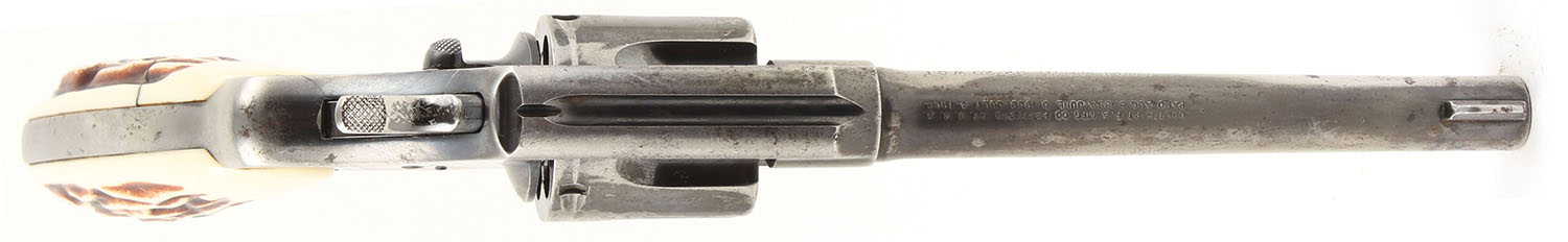 Colt, Army Special, CAL: 32-20 WCF, MFG: 1924, SN: 505149, DA/SA Revolver, 6'' Barrel. The faux stag grips are fair, they have two substantial cracks. There is a large crack on the left grip panel that runs vertically down the majority of the grip. There is a horizontal crack on the bottom of the right grip that runs about half way across the grip. The metal holds the factory blue finish. The blue on the barrel rates approximately 30% the sides of the barrel being worn down to gun metal gray with speckled shallow pitting. The frame rates approximately 60% with substantial handling wear as well as what appears to be some kind of chemical erosion causing the surface of the metal to flake & peel away. The factory markings are relatively crisp & all legible. Bore is good to very good, the rifling is strong & bright with very light roughness throughout & a couple of small spots of deep pitting throughout. Mechanically solid, seems to function well. A fixed front sight is integral to the barrel, a rear sight notch is cut into the frame. FFL or C&R Req. - Value: 300 to 600