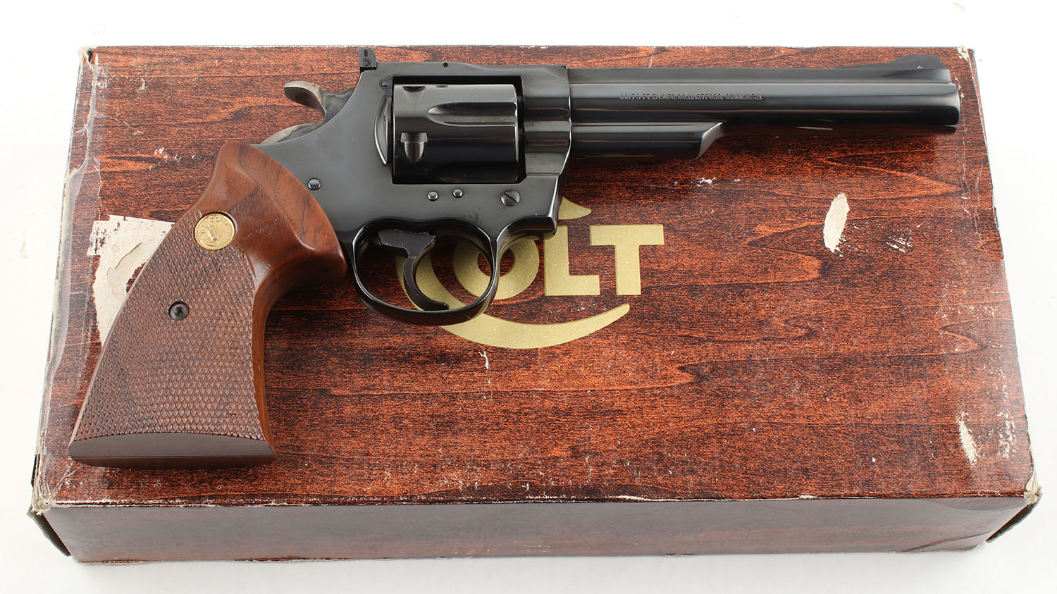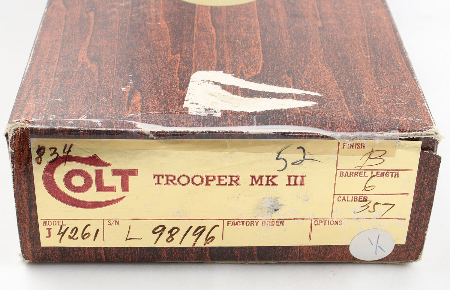 BOXED Colt, Trooper MK III, CAL: 357 MAG, MFG: 1978, SN: L98196, Double Action Revolver, 6'' Barrel. The factory checkered wood grips with Colt medallions are excellent, solid with very light handling wear. The blued finish on the gun is approximately 99% with light wear from use. Bore is excellent, the rifling is bright and strong. Mechanically very solid, seems to function well. There is a serrated front sight pinned to the barrel, a windage and elevation adjustable rear sight is screwed to the top of the frame. The sights have an all black sight picture. The gun comes in the serially matching factory cardboard box with a Colt sight adjustment tool, an owners manual, & other related paperwork. FFL Req. - Value: 800 to 1200