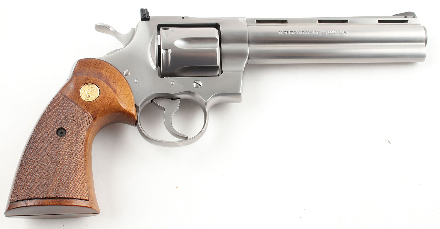 Colt, Python, CAL: 357 MAG, MFG: 1983-96, SN: K98725, DA/SA Revolver, 6'' Barrel. The factory checkered wood grips with Rampant Colt medallions are excellent with light handling wear. The matte stainless finish on the gun is excellent with minimal wear & a pronounced drag line. The factory markings are all crisp. Bore is excellent, bright with strong rifling & light even roughness near the muzzle. Mechanically very solid, seems to function well. The barrel holds a serrated ramp front sight, a windage & elevation adjustable rear sight is mounted to the frame. Comes in a generic soft pistol case. FFL Req. - Value: 1800 to 2500