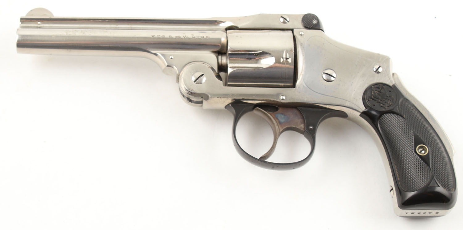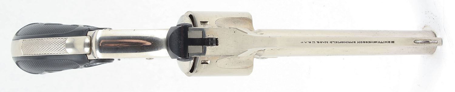 Smith & Wesson, .38 Safety Hammerless, CAL: 38 S&W, MFG: 1907-40, SN: 246321, Double Action Revolver, 4'' barrel. The top of the barrel is marked ''SMITH & WESSON SPRINGFIELD MASS USA''. The left side of the barrel is marked ''+38 S&W CTG+'', the right side of the barrel was marked ''SMITH & WESSON''. The right side of the frame is marked with the S&W trademark logo. The S&W monogram checkered hard rubber grips are excellent. The original nickel finish rates 95% overall, with visible brush strokes & intermittent light speckling. Case-colored trigger retains visible case-colors. Bore is excellent. Fixed notch rear sight & pinned blade front sight. A nice original example of a .38 Safety Hammerless. FFL or C&R Req. - Value: 600 to 1000