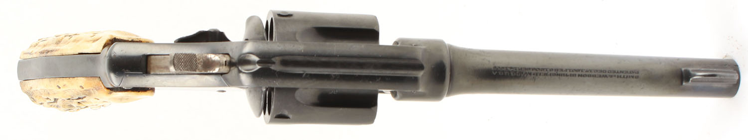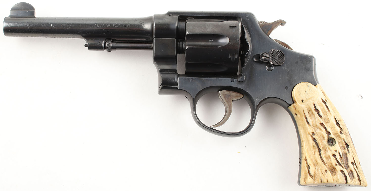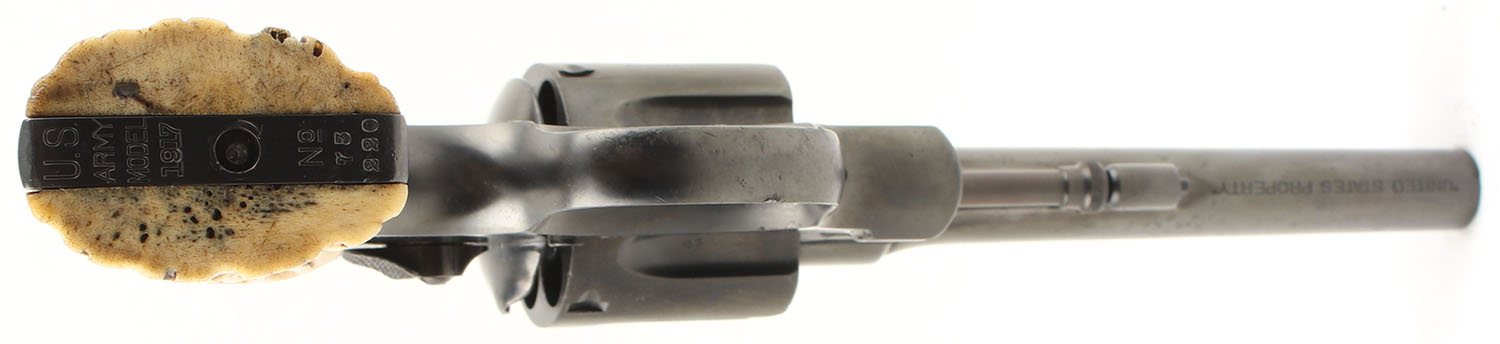 Smith & Wesson, US Army Model 1917, CAL: 45 ACP, MFG: June 1918, SN: 73220, DA/SA Revolver, 5 1/2'' Barrel. The authentic bone grips which appear to be shaped & cut to look like stag are very good, near excellent with some age soiling & discoloration. The metal holds a re-blued finish, maybe an arsenal refinish, that covers up speckled clean shallow pitting throughout. The finish has retained nearly full coverage & rates approximately 95%. The top of the barrel is marked with standard address & patent dates. The bottom of the barrel is marked ''UNITED STATES PROPERTY''. The left side of the barrel is marked ''S&W D.A. 45''. The left side of the frame above the trigger guard has a ''EAGLE HEAD'' over a very faint, non-legible ''S9'' proof & there's a ''FLAMING BOMB'' proof in front of the hammer. There are multiple British Commercial proof marks on the cylinder, right side of the frame & caliber marking on the right side of the barrel. The butt is marked ''U.S ARMY MODEL 1917 NO 73220''. Bore is fair, the rifling is slightly thinned & slightly darkened with light even roughness throughout. Mechanically solid, seems to function well. The barrel holds a fixed front sight, a rear sight notch is cut into the top of the frame. FFL or C&R Req. - Value: 500 to 1000