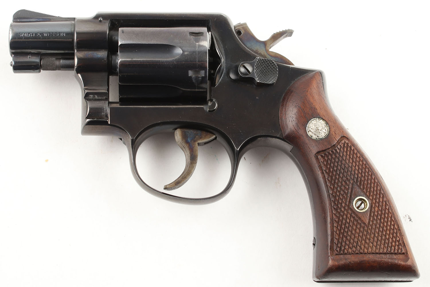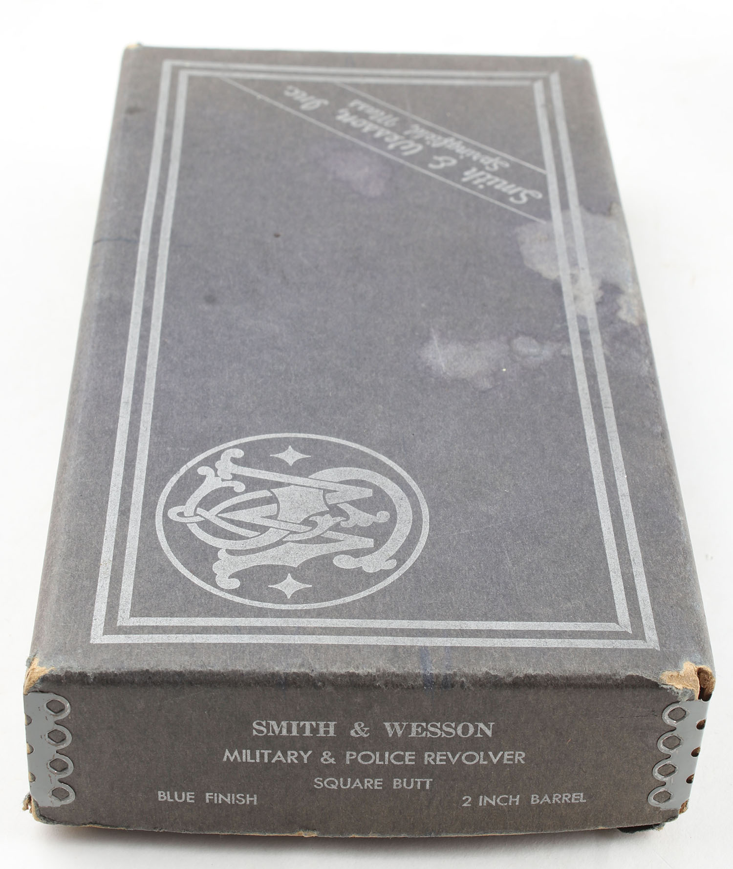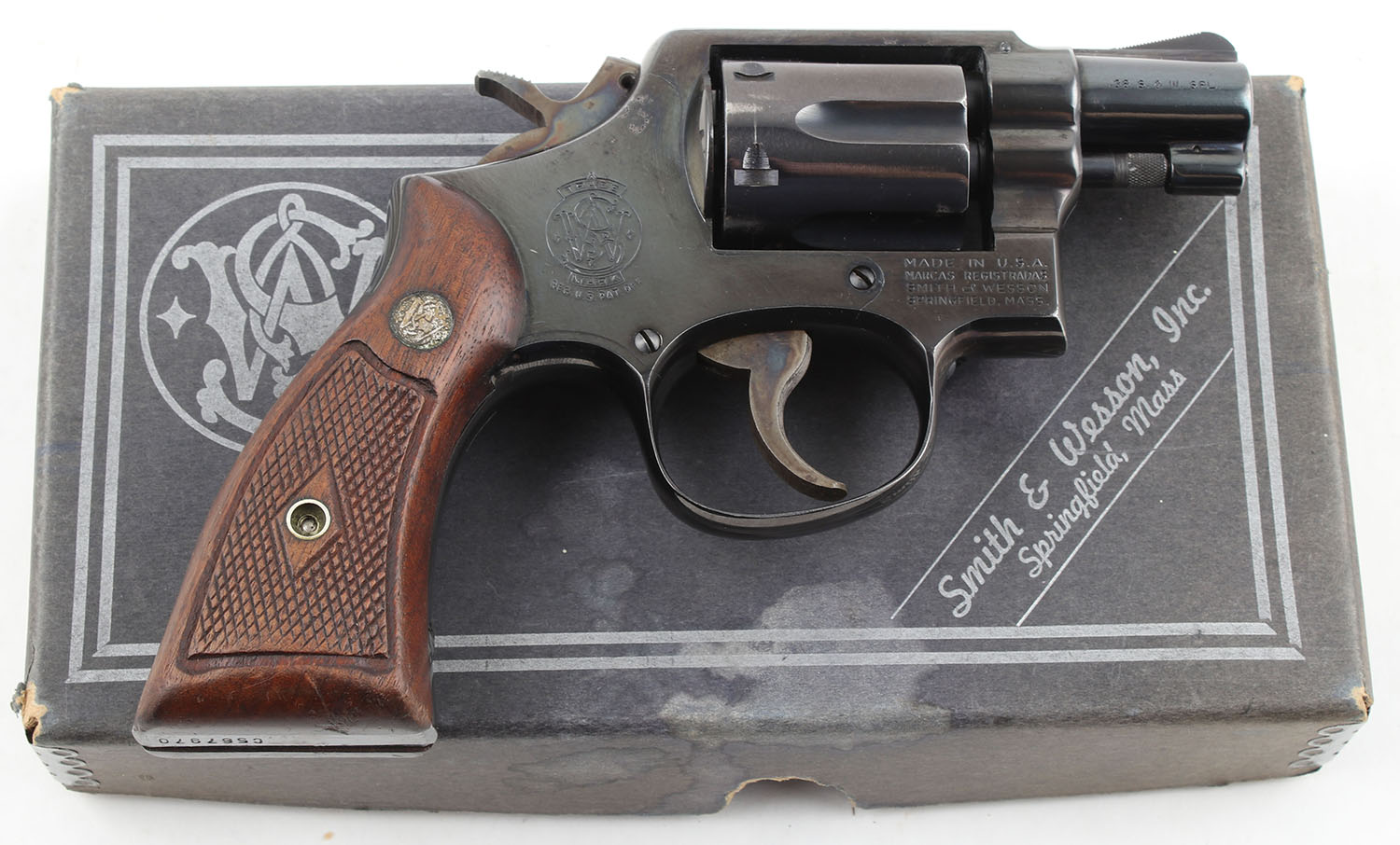 Smith & Wesson, Model 10-2, CAL: 38 SPL, MFG: 1961-62, SN: C567970, DA/SA Revolver, 2'' Barrel. The factory checkered wood grips with ''S&W'' medallions are very good, near excellent, solid with checkering that has worn thin & some small dings & scratches throughout. The metal holds the factory blued finish and rates approximately 95% overall with some use wear, including a drag line. There are a couple of splotches of clean pitting throughout. The case coloring on the hammer & trigger is very good, slightly faded. All of the standard markings around the gun are crisp. Bore is excellent, bright with strong rifling. Mechanically solid, seems to function well. The barrel holds a serrated fixed front ramp sight. A rear sight notch is cut into the top of the frame. The sight picture is all black. Comes in a non-serially matching box that is correct to the make, model, & era with some wax paper. FFL or C&R Req. - Value: 500 to 800