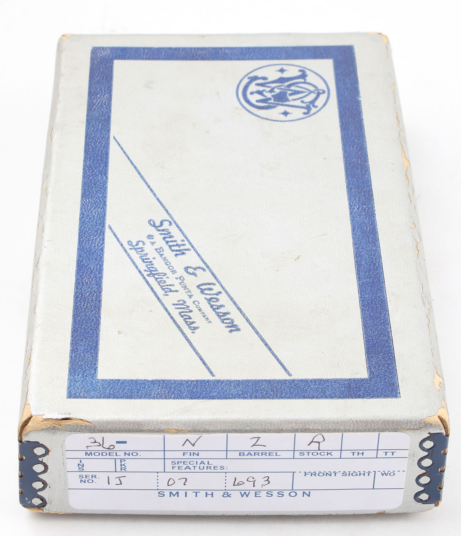BOXED Smith & Wesson, Model 36, CAL: 38 SPL, MFG: 1982, SN: 1J07693, DA/SA Revolver, 2'' Barrel. The factory checkered wood grips with ''S&W'' medallions are excellent, solid with slightly worn checkering. The metal holds a nickeled finish. The finish is excellent with light use wear including a drag line, some wear near the muzzle & some wear on the front strap & backstrap of the grip. The case coloring on the trigger & hammer is very good, slightly faded. All of the standard markings around the gun are crisp. Bore is excellent, bright with strong rifling. Mechanically solid, seems to function well. The barrel holds a serrated fixed front ramp sight with some red paint or finger nail polish. A rear sight notch is cut into the top of the frame. Comes in a non-serially matching box that is correct to the make, model, & era with some related paperwork & wax paper. FFL Req. - Value: 400 to 600