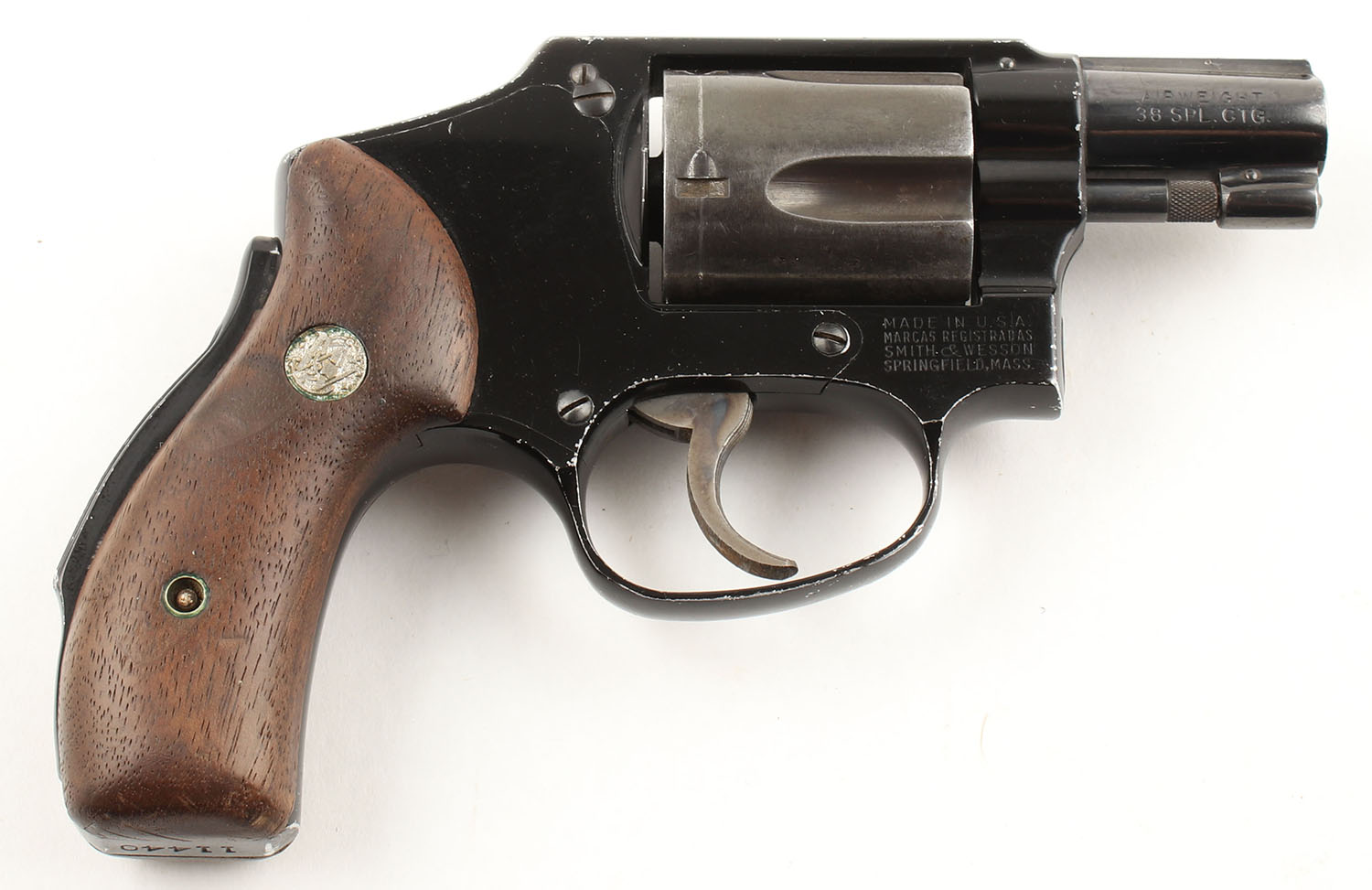 Smith & Wesson, Model 42 Airweight, CAL: 38 SPL, MFG: 1952-71, SN: 11440, DAO Revolver, 2'' Barrel. The factory smooth wood grips with ''S&W'' medallions are very good, solid with substantial wear from carry & use, the protective clear coat that was applied to the wood at the factory has worn almost entirely away. The alloy frame holds a black finish, the finish is very good with substantial edge wear. The blue on the cylinder has worn thin & begun to tone to a brown patina leaving a mix of gun metal gray, original blue, & brown patina. The blue on the barrel has some small splotches of clean shallow pitting as well as some dings on the muzzle & holster wear. All of the standard markings around the gun are crisp. Bore is very good, bright with strong rifling & a couple of small deep pits near the muzzle. Mechanically solid, seems to function well. The front sight appears to have been ground off. A rear sight notch is cut into the top of the frame. FFL or C&R Req. - Value: 200 to 400