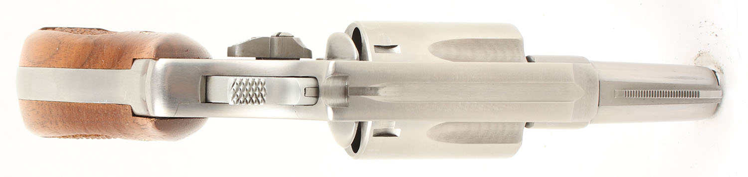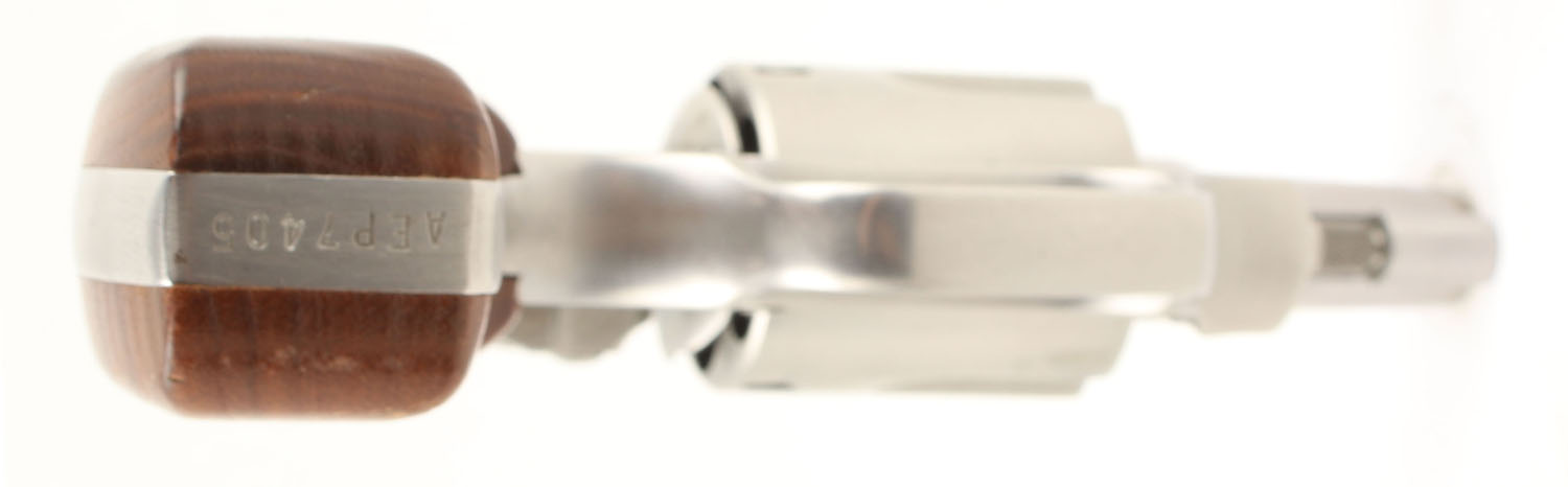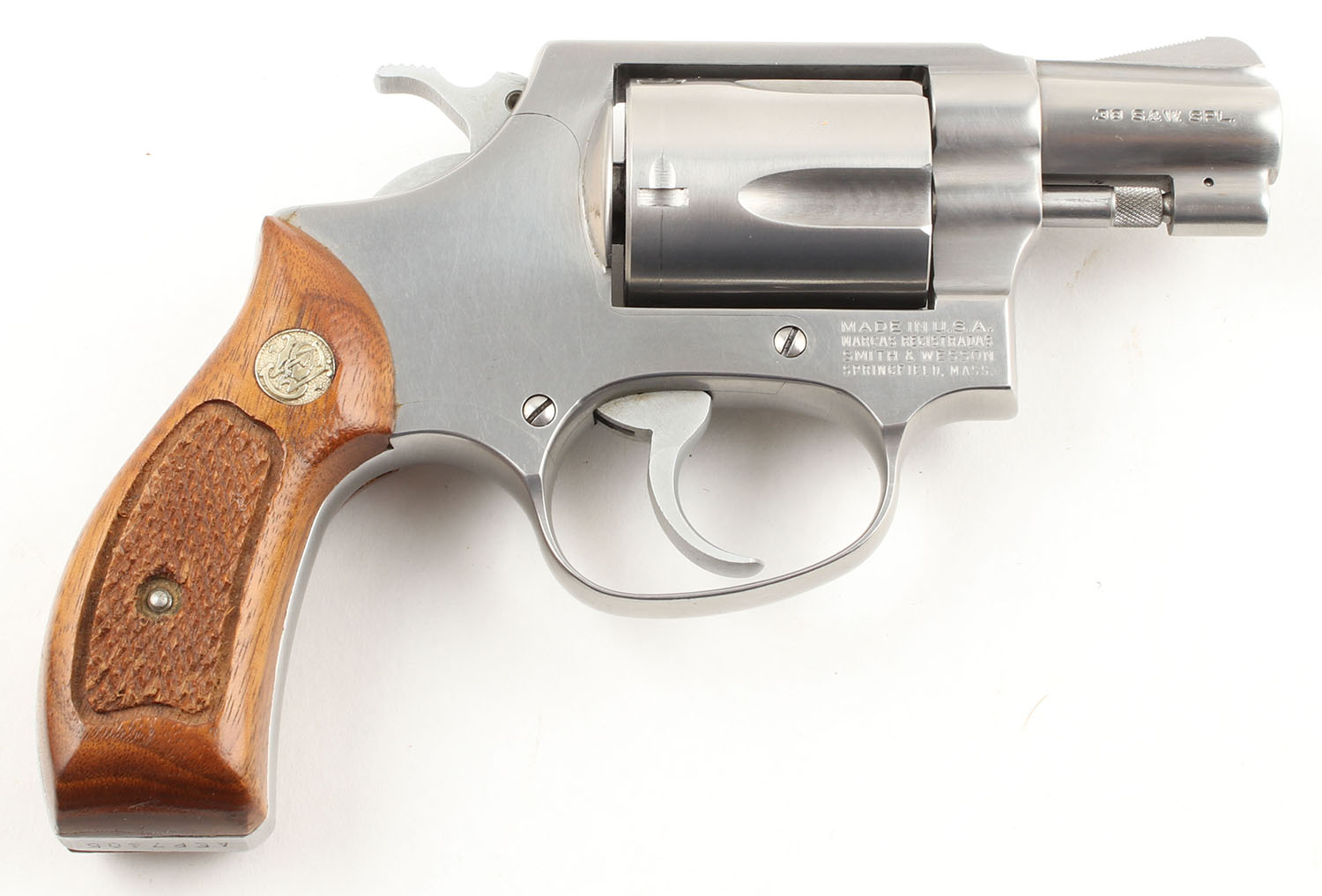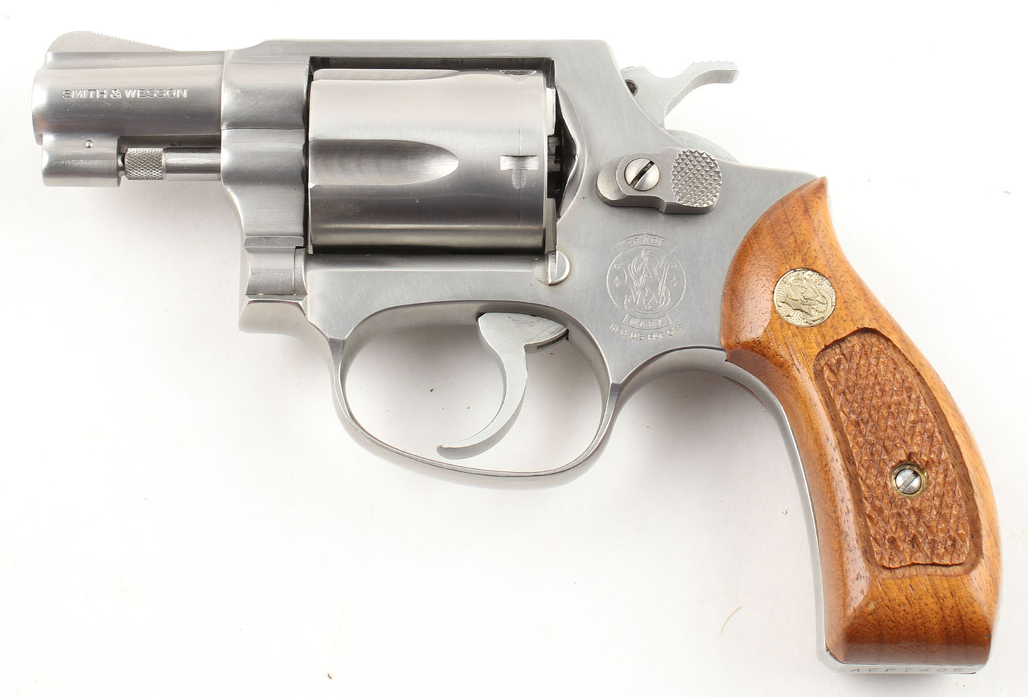 Smith & Wesson, Model 60, CAL: 38 SPL, MFG: 1980's, SN: AEP7405, DA/SA Revolver, 2'' Barrel. The factory checkered wood grips with ''S&W'' medallions are excellent, solid with minimal wear. The stainless finish on the gun is excellent with minimal wear. All of the standard markings around the gun are crisp. Bore is excellent, bright with strong rifling. Mechanically solid, seems to function well. The barrel holds a serrated fixed front ramp sight. A rear sight notch is cut into the top of the frame. Comes with a generic soft nylon holster. FFL Req. - Value: 400 to 800