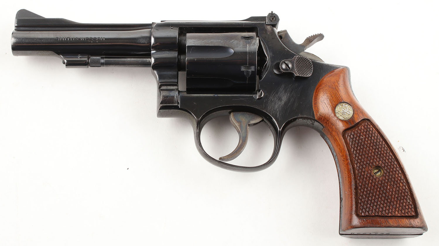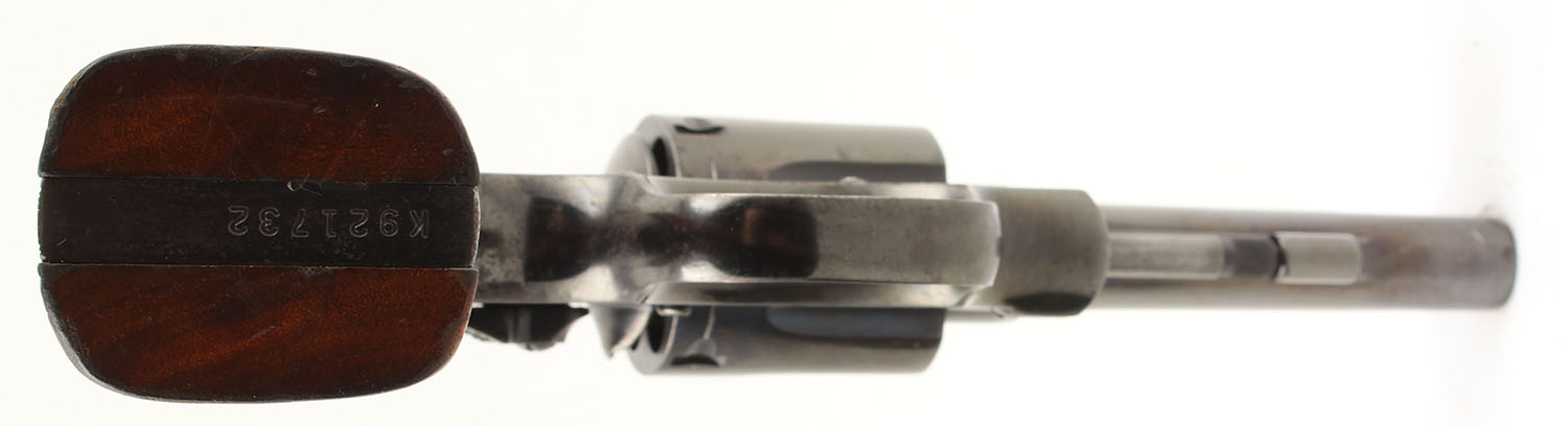 Smith & Wesson, Model 15-3 ''Combat Masterpiece'', CAL: 38 SPL, MFG: 1969, SN: K921732, DA/SA Revolver, 4'' Barrel. The factory checkered wood grips with ''S&W'' Medallions are very good with some edge chipping around the checkering & age soiling. The factory blued finish rates approximately 85% with some surface scratches, edge wear, & wear from use. There is a gun metal gray drag line. The barrel near the muzzle has thinned from holster wear exposing gun metal grey. There is some patina in the serrations of the front strap backstrap. All of the standard markings around the gun are visible & legible. Bore is excellent, bright with strong rifling. Mechanically solid, seems to function well. The barrel holds a serrated fixed front ramp sight. A windage & elevation adjustable rear sight is mounted to the top of the frame. Comes in a Smith & Wesson box with wax paper, a dry fire target, & an owners manual. FFL or C&R Req. - Value: 500 to 800
