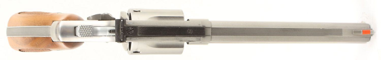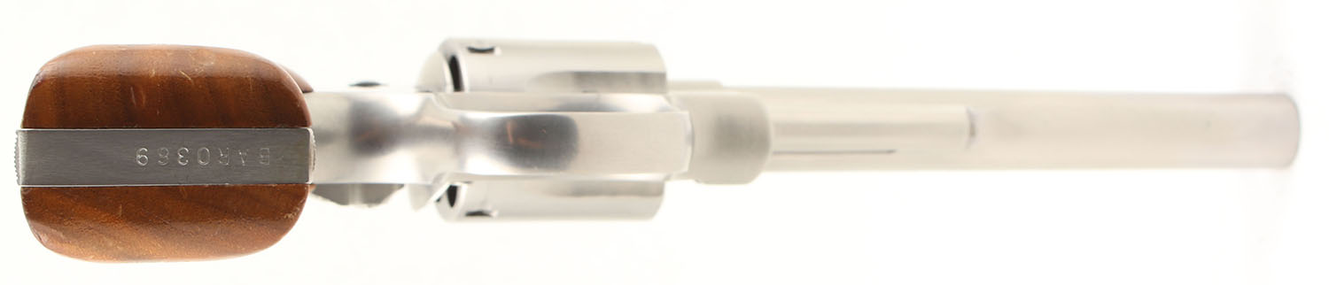 Smith & Wesson, Model 66-2, CAL: 357 MAG, MFG: 1970-2004, SN: BAR0369, DA/SA Revolver, 5 7/8'' Barrel. The factory checkered wood grips with ''S&W'' medallions are excellent with light wear & a couple of small dings. The matte stainless finish on the gun is excellent with some wear from use. All of the standard markings around the gun are crisp. Bore is excellent, bright with strong rifling. Mechanically solid, seems to function well. The barrel holds a fixed front sight with a red plastic insert. A windage & elevation adjustable rear sight is mounted to the top of the frame. FFL Req. - Value: 600 to 900