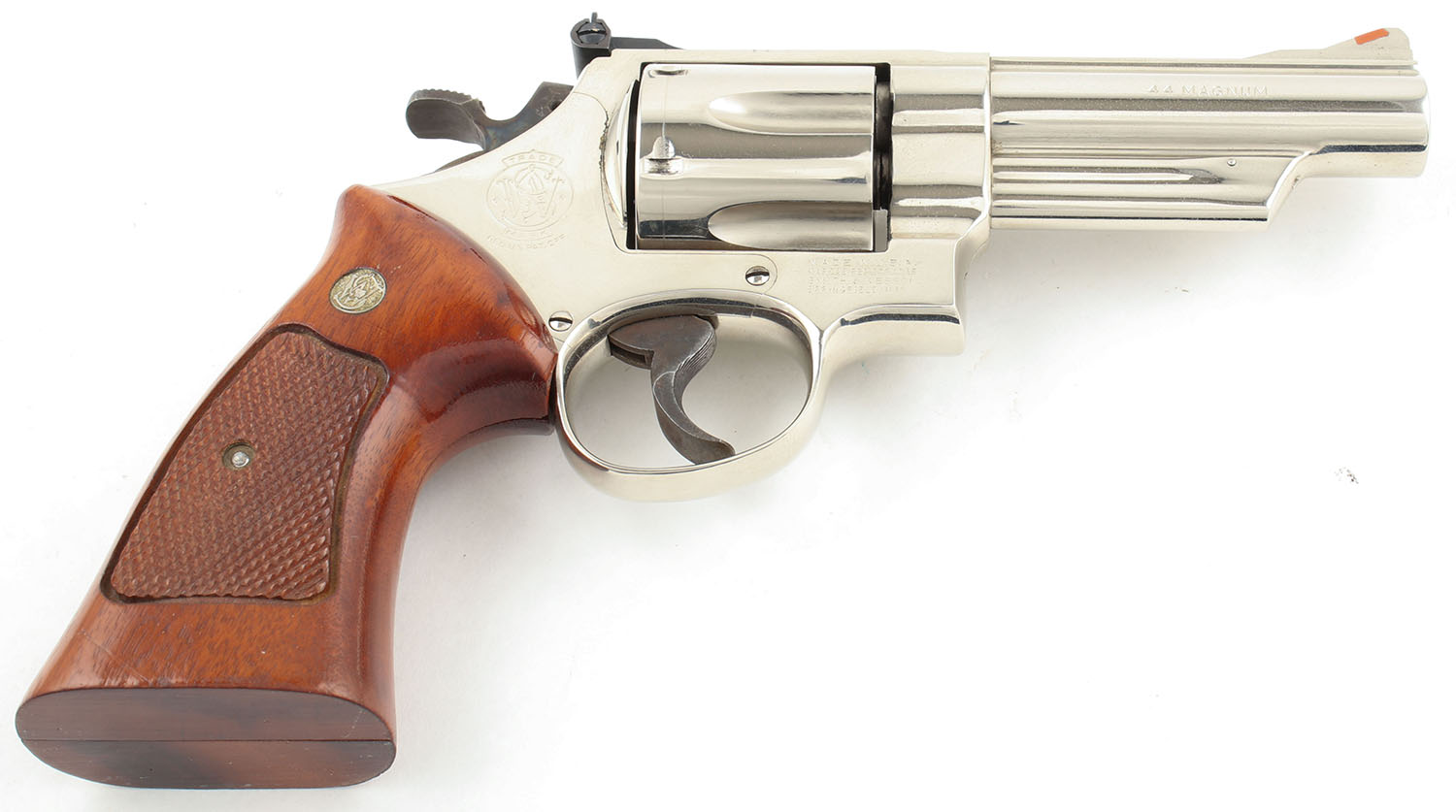Smith & Wesson, Model 29-2, CAL: 44 MAG, MFG: 1980-83, SN: N889355, DA/SA Revolver, 4 1/8'' Barrel. The factory checkered wood grips with ''S&W'' medallions are very good, near excellent, with light edge chipping near the checkering & some small dings & surface scratches throughout. The original nickeled finish on the gun is good to very good with some use wear & consistent, even speckled erosion showing from under the nickel without erosion poking through. All of the standard markings around the gun are visible & led gable. Bore is excellent, bright with strong rifling. Mechanically solid, seems to function well. The barrel holds a fixed front sight with a red plastic insert. A windage & elevation adjustable rear sight with a white square ''U'' notch is mounted to the top of the frame. FFL or C&R Req. - Value: 600 to 1200