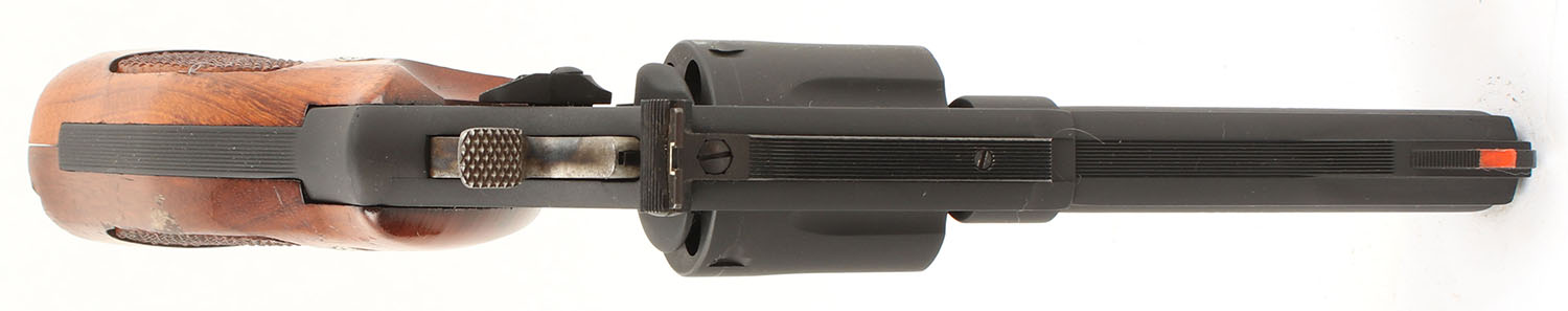 Smith & Wesson, Model 586-1 ''Distinguished Combat Magnum'', CAL: 357 MAG, MFG: 1986-99, SN: AUV6804, DA/SA Revolver, 4'' Barrel. The factory checkered wood grips with ''S&W'' medallions are very good, near excellent, with some handling wear & small dings & surface scratches throughout. There are also a couple of edge chips throughout & a splintered section near the edge of the checkering. The metal carries what appears to be a non-factory professionally applied parkerized finish. The finish is excellent with a drag line & light use wear. All of the standard markings around the gun are slightly faded from the Parkerizing process but still visible & legible. Bore is excellent, bright with strong rifling. Mechanically solid, seems to function well. The barrel holds a fixed front sight with a red plastic insert. A windage & elevation adjustable rear sight with a white square ''U'' notch is mounted to the top of the frame. Comes with a Smith & Wesson factory cardboard box for a 586 with a non matching serial number & other packing material. FFL or C&R Req - Value: 500 to 1000