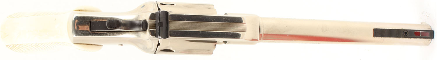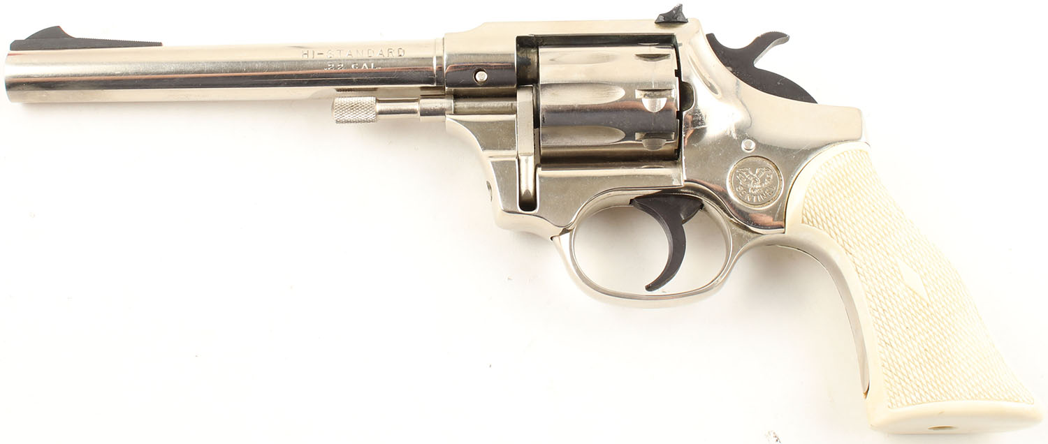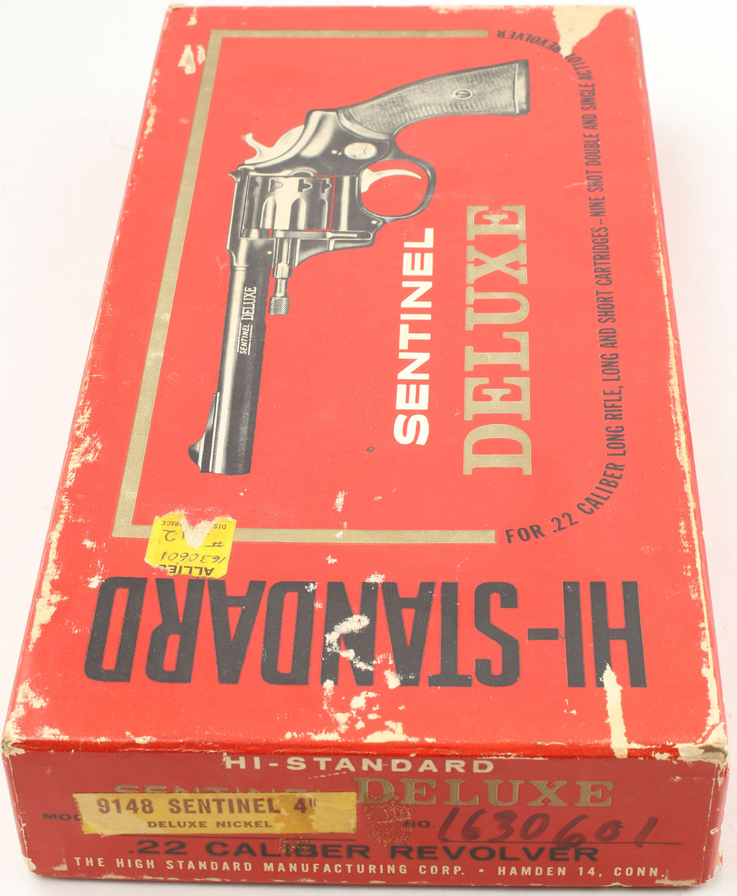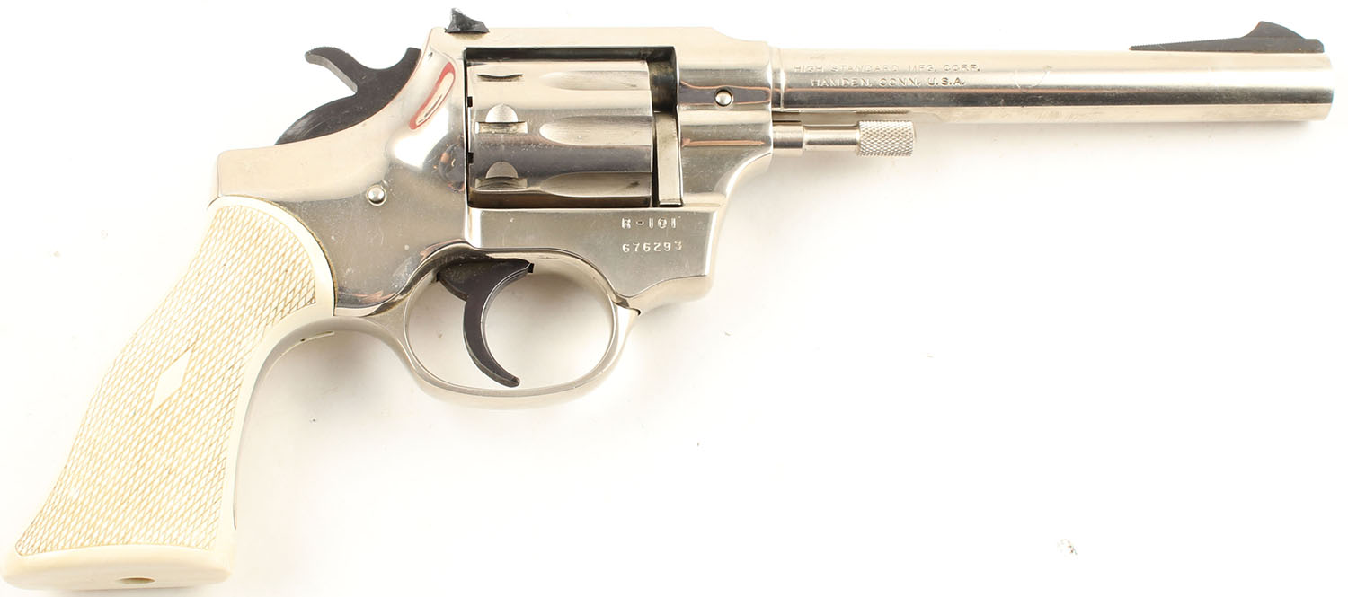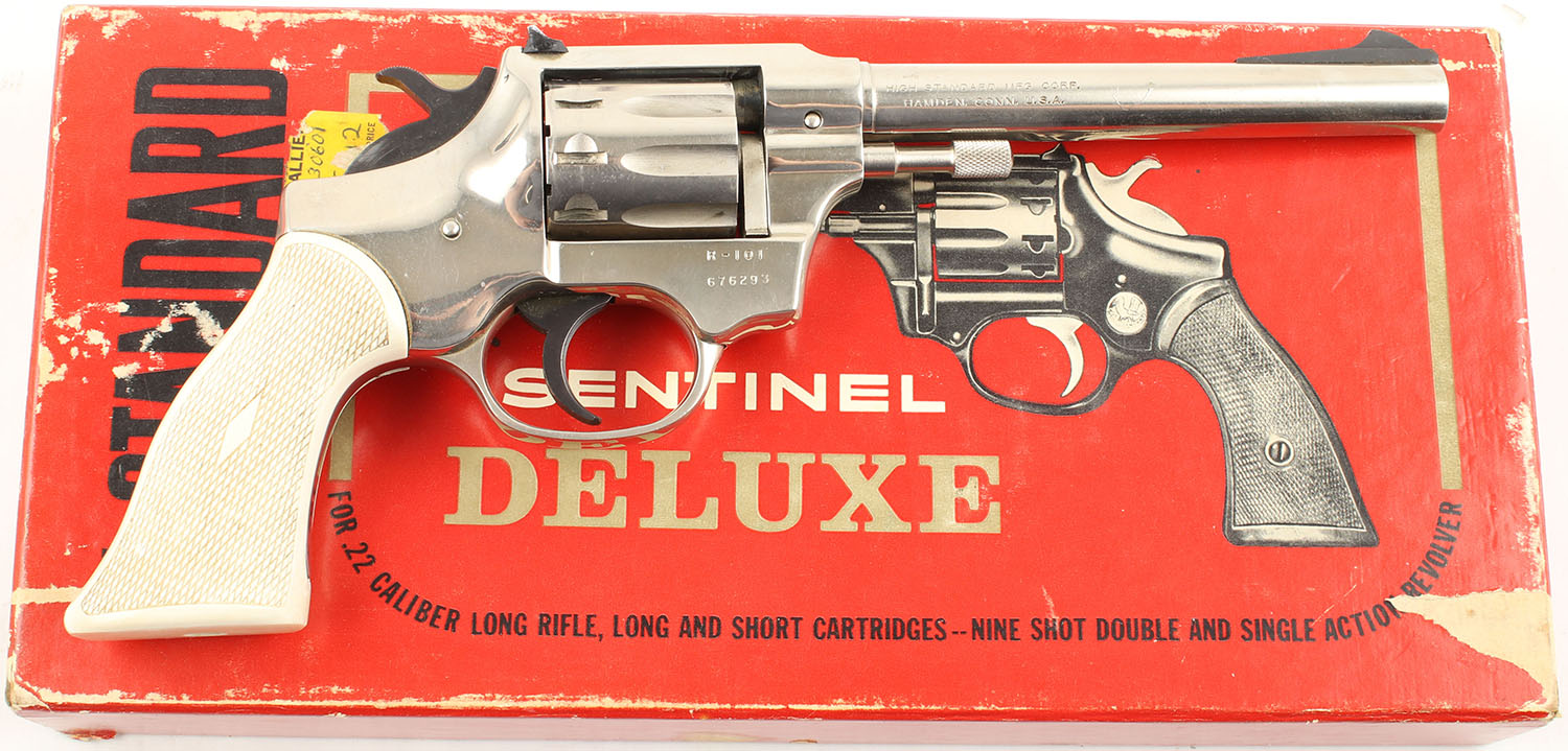 High Standard MFG. CORP. (Hi-Standard), Model Sentinel R-101, CAL: 22 LR, MFG: 1956, SN: 676293, DA/SA Revolver, 6'' Barrel. The synthetic white checkered grips are very good with thinned checkering & some small dings & scratches throughout. The factory nickeled finish on the gun is very good with a thin layer of haze over the gun & very light speckled flaking. All of the standard markings around the gun are crisp. Bore is excellent, bright with strong rifling. Mechanically solid, seems to function well. The barrel holds a fixed front sight with red nail polish for contrast. A rear sight is set in a dovetail cut in the top of the frame. Comes in a Hi-Standard Sentinel Deluxe box with an owners manual & other related paperwork. FFL or C&R Req. - Value: 250 to 500