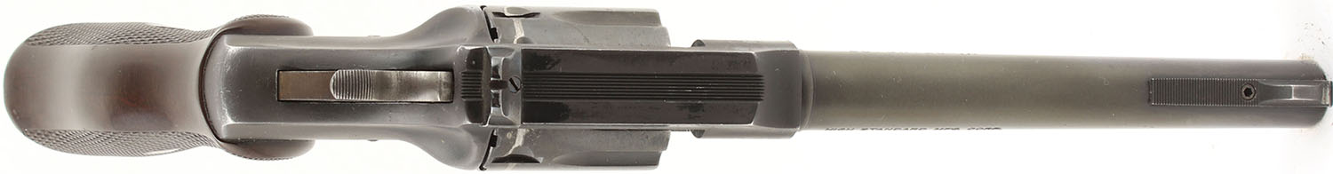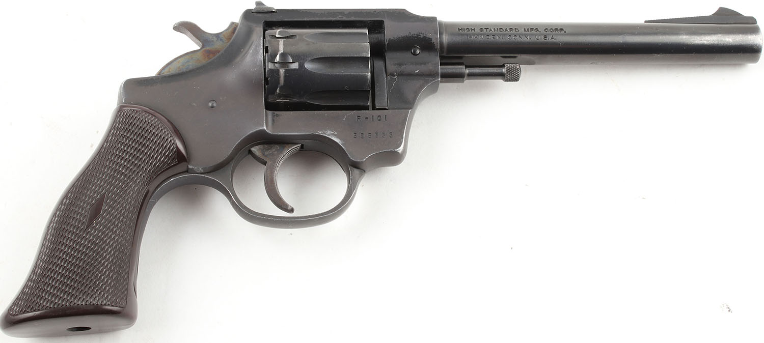 High Standard MFG. CORP. (Hi-Standard), Model Sentinel R-101, CAL: 22 LR, MFG: 1955, SN: 596533, DA/SA Revolver, 6'' Barrel. The synthetic brown checkered grips are excellent with minimal handling wear. The factory blued finish rates approximately 85% on the barrel & cylinder with the frame having very little remaining blue. The frame holds a fairly even brown patina with some remaining blue in protected areas. All of the standard markings around the gun are crisp. Bore is excellent, bright with strong rifling. Mechanically fair, seems to function well for the most part. The cylinder will spin freely clockwise (the opposite direction of operational rotation). This gun should be inspected by a gunsmith before firing. The barrel holds a fixed front sight. A rear sight is set in a dovetail cut on the top of the frame. SOLD ''AS IS'', NO RETURNS. FFL or C&R Req. - Value: 150 to 250