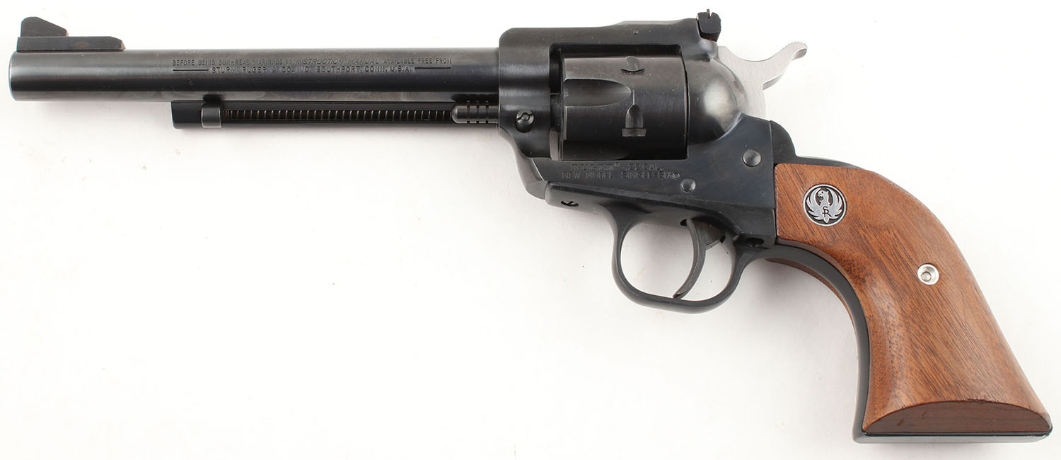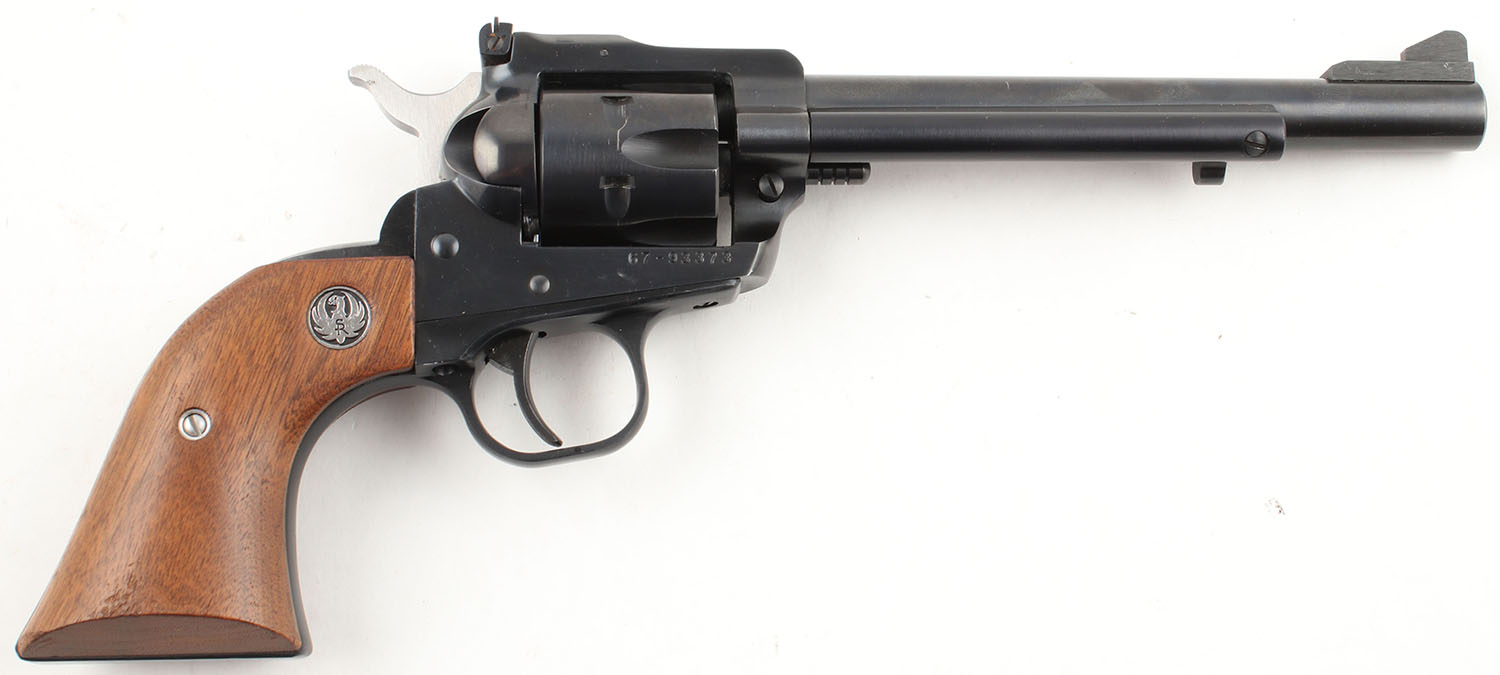 Ruger, New Model Single Six, CAL: 22 LR, MFG: 1980, SN: 67-93373, SAO Revolver, 6 1/2'' Barrel. The factory wood grips with Ruger medallions are very good, near excellent, with some wear including light edge chipping & some small dings & scratches. The factory blued finish on the gun rates approximately 98% with light wear from use. All of the standard markings around the gun are crisp. Bore is excellent, bright with strong rifling. Mechanically solid, seems to function well. The barrel holds a fixed front sight. A windage & elevation adjustable rear sight is mounted to the top of the frame. Comes with a 22 MAG conversion cylinder in a red pouch. FFL Req. - Value: 250 to 500
