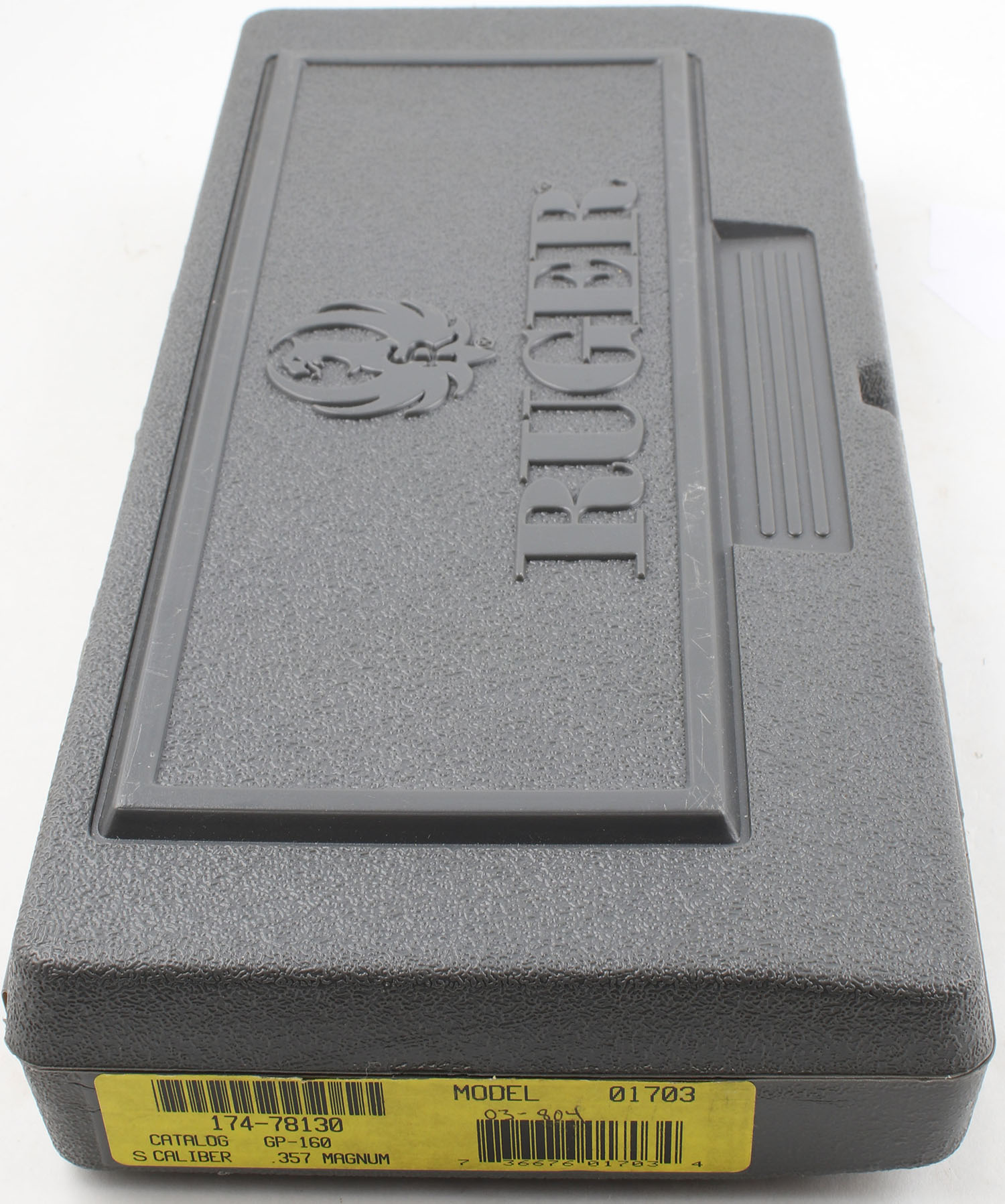 CASED Ruger, GP100, CAL: 357 MAG, MFG: 2003, SN: 174-78130, DA/SA Revolver, 6'' Barrel. The factory rubber grips with wood inserts are excellent with minimal wear. The factory blued finish on the gun rates approximately 99% with light use wear. All of the standard markings around the gun are crisp. Bore is excellent, bright with strong rifling. Mechanically solid, seems to function well. The barrel holds a fixed front sight. A windage & elevation adjustable rear sight is mounted to the top of the frame. Comes in the serially matched factory hard plastic case with a lock, cartridge casings from factory test firing, & an owners manual. FFL Req. - Value: 400 to 600