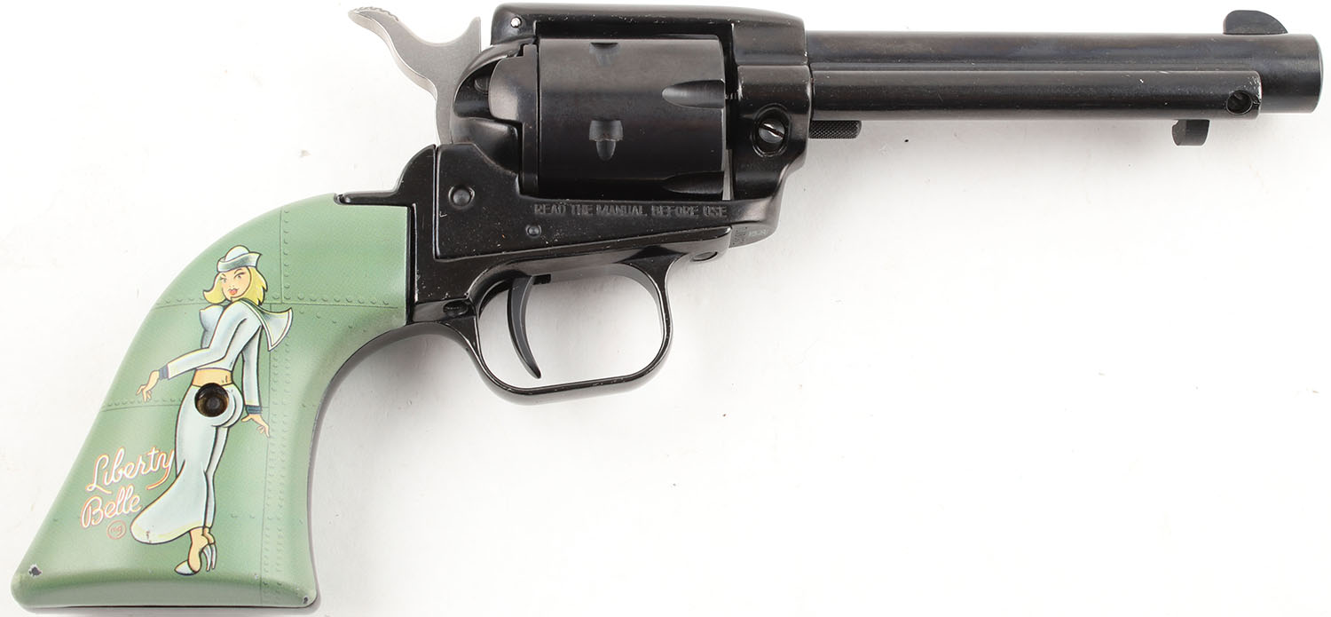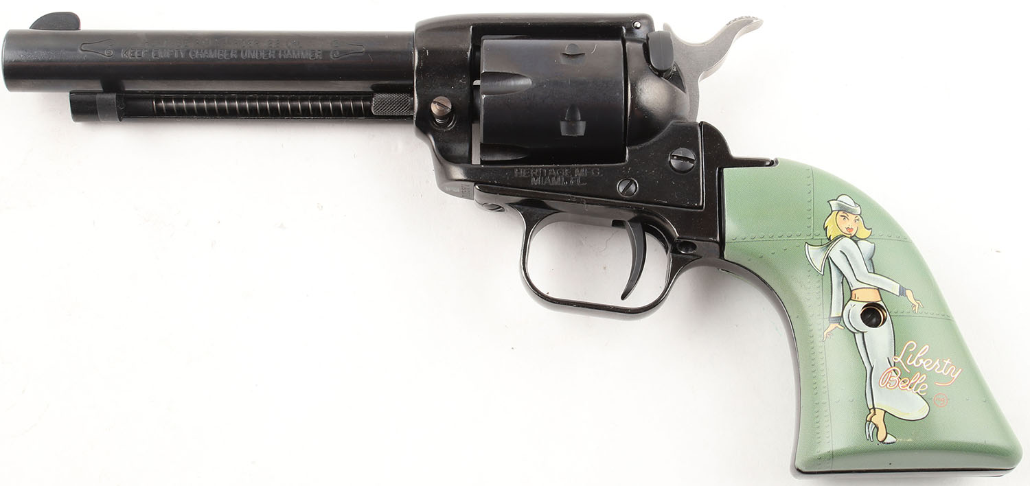 Heritage, Rough Rider, CAL: 22 LR, MFG: Modern, SN: TL0B1372, SAO Revolver, 4 3/4'' Barrel. The factory plastic ''Liberty Bell Pinup Girl'' grips are excellent with minimal wear. The black finish on the gun is excellent with light wear. All of the standard markings around the gun are crisp. Bore is excellent, bright with strong rifling. Mechanically solid, seems to function well. The barrel holds a fixed front sight. A rear sight notch is cut into the top of the frame. FFL Req. - Value: 100 to 200