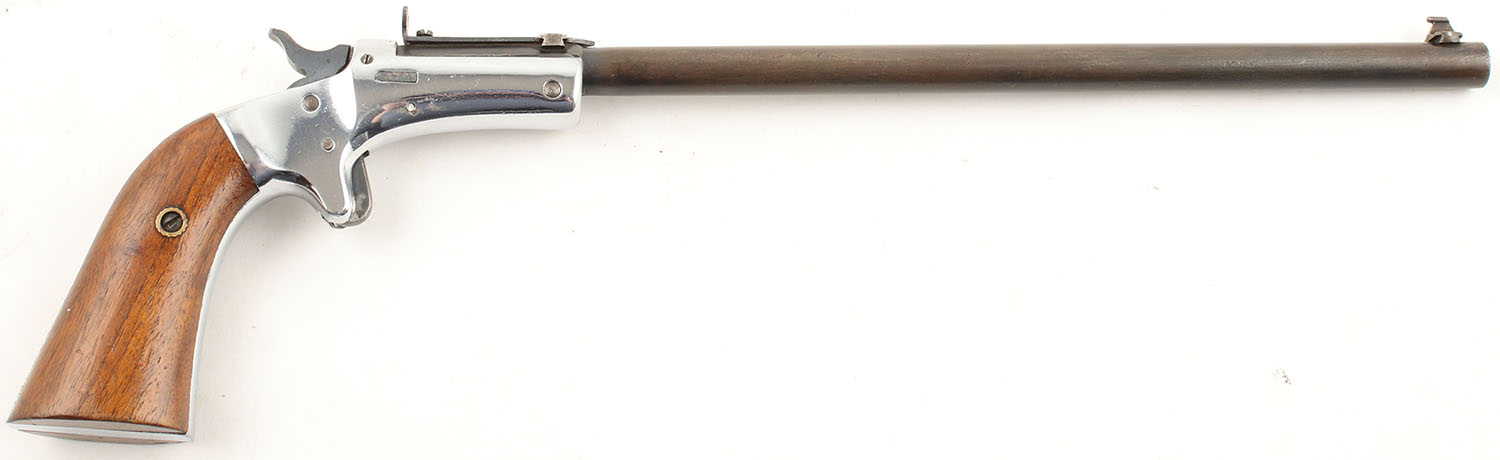 J. Stevens A&T Co., No. 43 ''Diamond'', CAL: 22 LR, MFG: 1896-1916, SN: 61678, Single Shot Tip Up Pistol, 9 3/4'' Barrel. The wood grips are very good, near excellent, solid with light wear. The nickeled finish on the frame is very good, near excellent, with light wear. The blue on the barrel has thinned slightly & toned to a brown patina with some exposed gun metal grey near the muzzle & small remainders of original blue in protected areas. Bore is poor, dark with thin rifling & deep pitting throughout. Mechanically solid, seems to function well. The barrel holds a fixed front sight. A rear sight is set on the top of the frame. FFL or C&R Req. - Value: 100 to 300