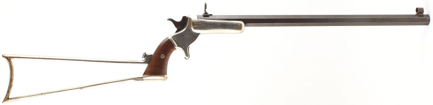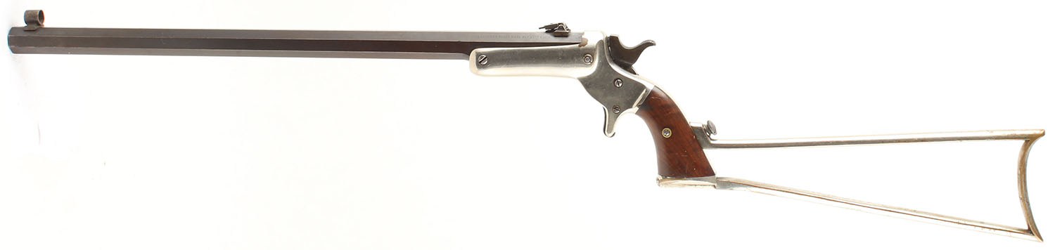J. Stevens & Co., Model 34 Hunters Pet, CAL: 38 RF, MFG: 1872-87, SN: 76, Single Shot Tip Up Rifle, 18 1/8'' Barrel. The wood grips are excellent, solid with light wear. The nickeled finish on the frame is very good with light wear & some flaking. The blue on the octagonal barrel has thinned on the edges exposing gun metal gray. The blue has toned to a mix of brown patina & original blue with some thinning. Bore is fair to good, slightly thinned & darkened with light even roughness throughout & some splotches of shallow pitting. Mechanically solid, seems to function well. The barrel holds a hooded fixed front sight & a flip up rear sight. FFL or C&R Req. - Value: 600 to 1200