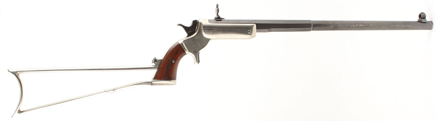 J. Stevens & Co., Model 34 Hunters Pet, CAL: 32 RF, MFG: 1872-87, SN: 2532, Single Shot Tip Up Rifle, 18'' Barrel. The wood grips are very good to excellent, solid with light wear & several dings & surface scratches, most notably on the right grip panel. The nickeled finish on the frame is very good, near excellent, with light wear & minimal flaking. The blue on the barrel rates approximately 75% with some thinning & some areas beginning to tone to a brown patina. Bore is very good, bright & strong with some splotches of shallow pitting mostly concentrated near the center of the bore. Mechanically solid, seems to function well. The barrel holds a hooded fixed front sight & a flip up rear sight. Antique, No FFL Req. - Value: 600 to 1200