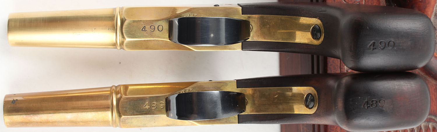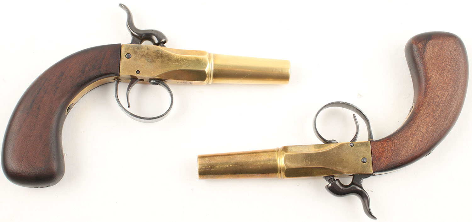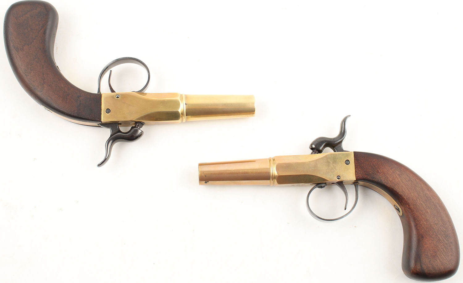 CASED SET Redwood Arms New Zealand, Derringer, CAL: .39 Cal, MFG: Modern, SN: 489 & 490, Single Shot Cap & Ball Derringers (Not Thread Breech), 2 3/4'' Barrel. The wood grips are excellent, solid with minimal wear. The solid brass frame & barrel are excellent, with minimal wear. Bore is excellent, bright & smooth with machining marks. Mechanically solid, seems to function well. Comes in a wood case that is fitted to the contents & lined with red fabric. The case holds two percussion pistols, a powder flask, a round ball casting mold, a nipple wrench, a ram rod, & a cleaning rod. BP No FFL Req. - Value: 200 to 400